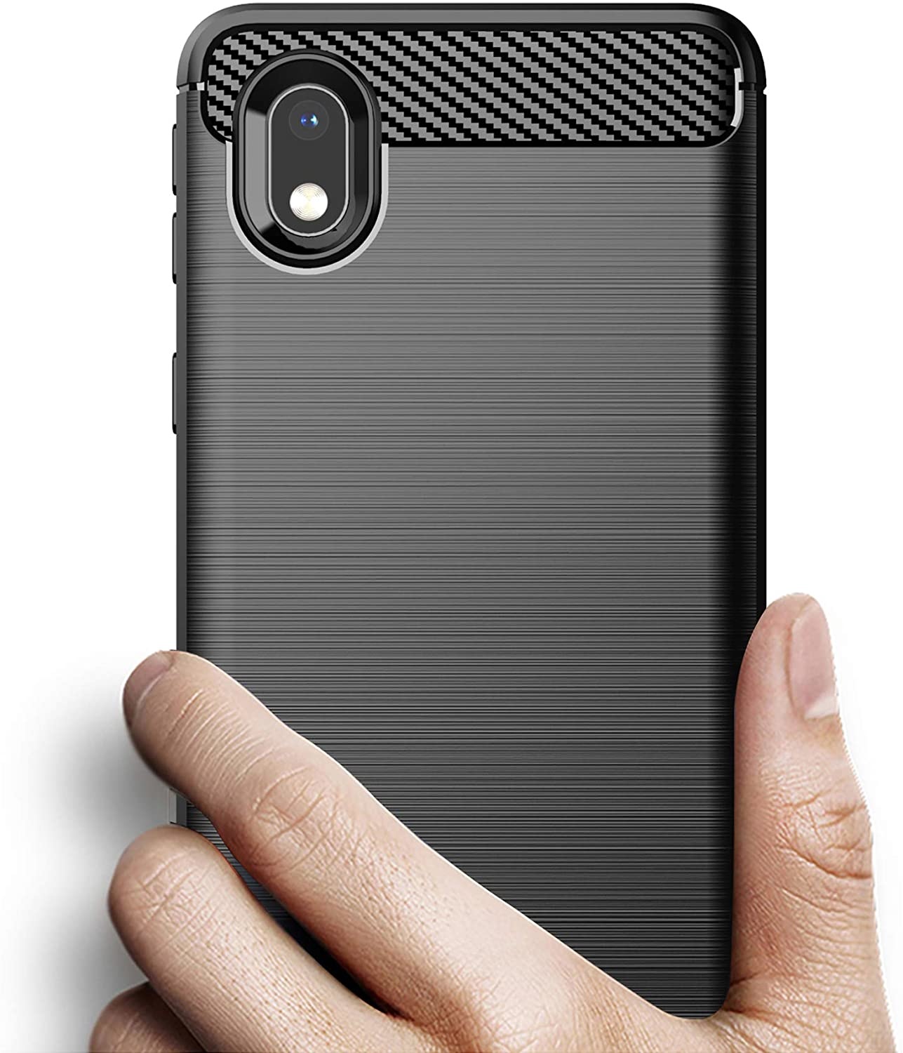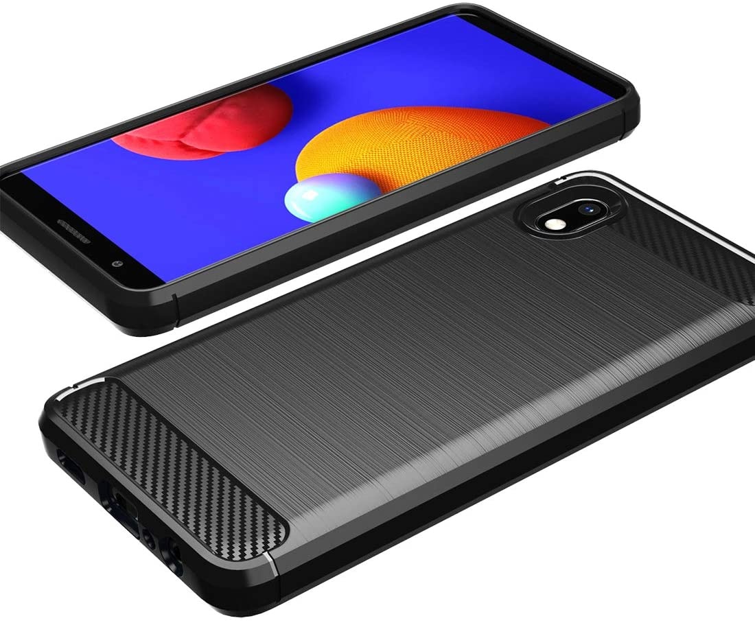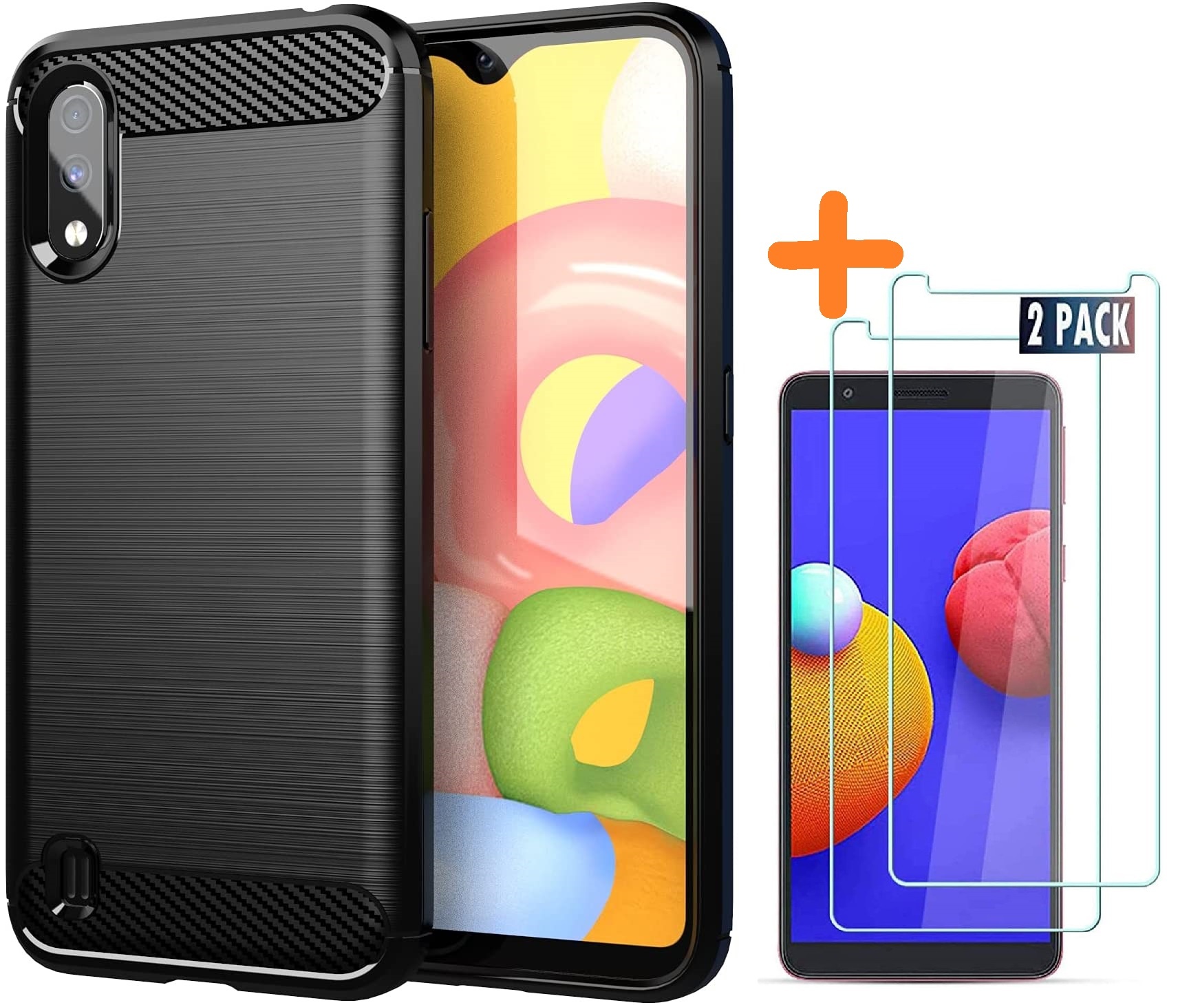 Hoesje Geschikt Voor Samsung Galaxy A01 Core hoesje Geborsteld Zwart siliconen Carbon Fiber Optics - Brushed Silicone Colour TPU Cover Screenprotector 2 pack