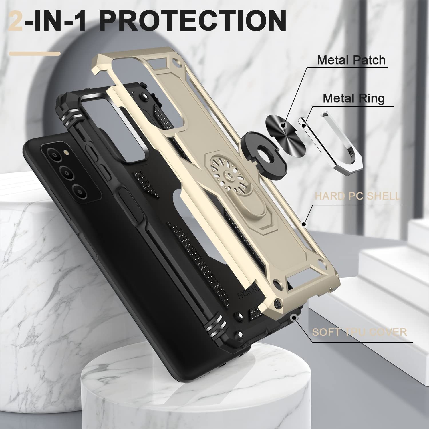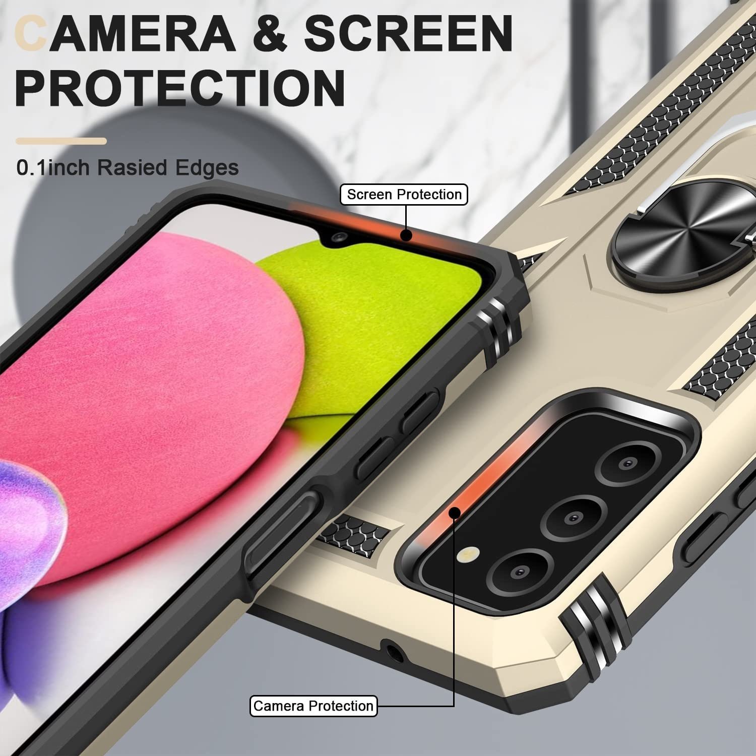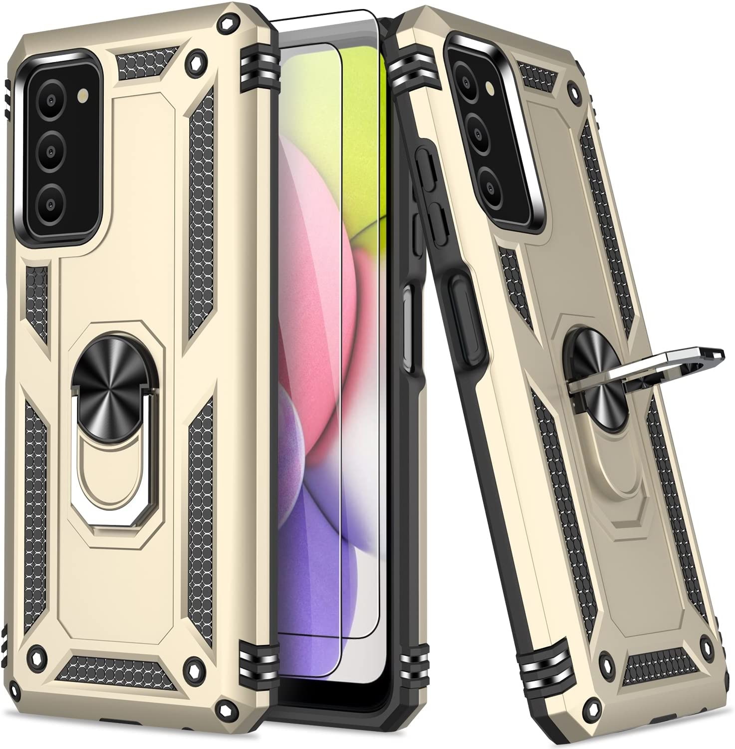 Samsung A03 Hoesje Anti-Shock Hybrid Armor hoesje Goud - Samsung Galaxy A03 kickstand Ring houder TPU backcover hoesje - met screenprotector Galaxy A03 - 2 pack