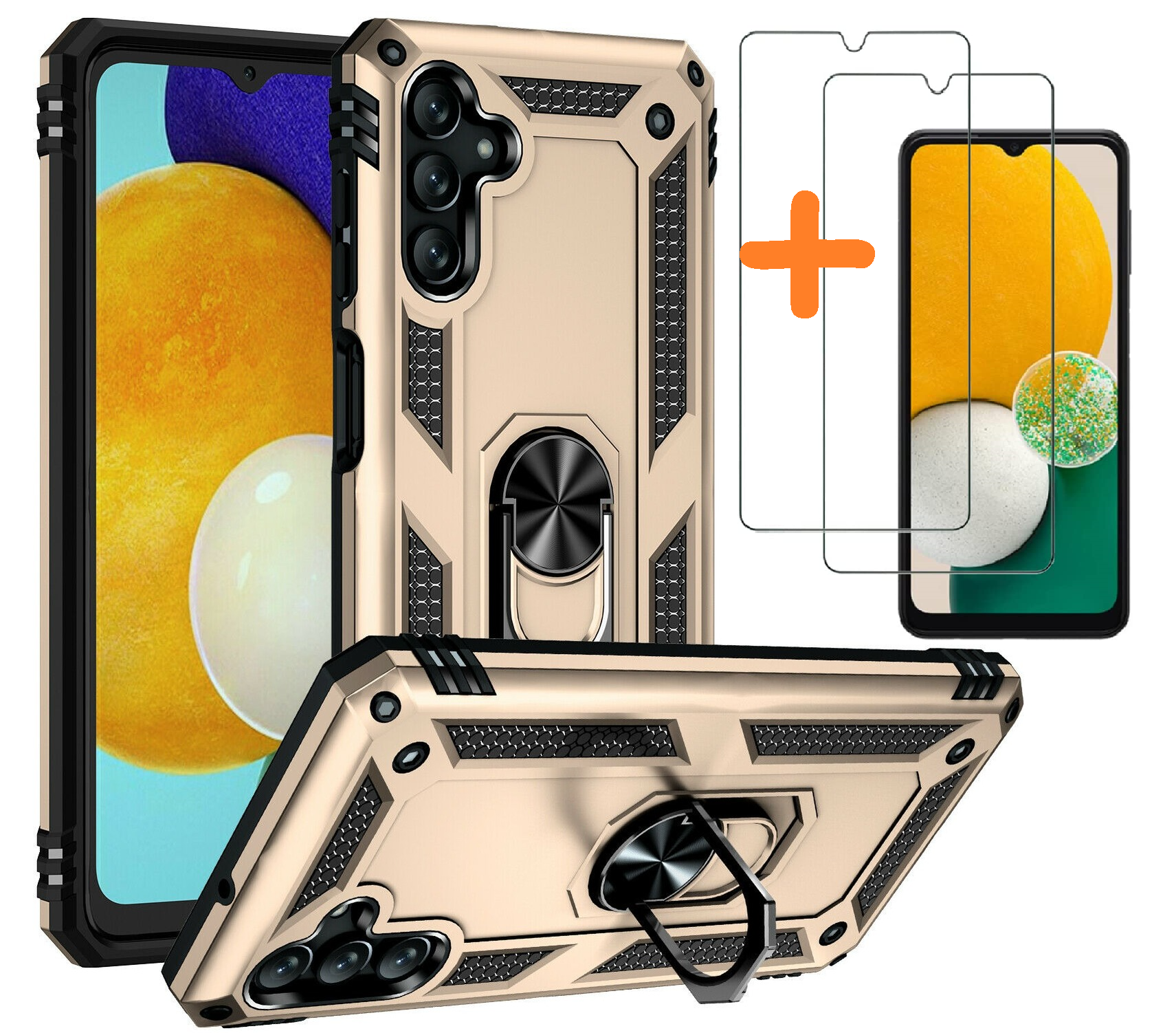 Hoesje Geschikt Voor Samsung Galaxy A04S Hoesje Anti-Shock Hybrid Armor hoesje Goud - Hoesje Geschikt Voor Samsung Galaxy A04s / A13 5G ring houder TPU backcover hoesje - screenprotector Galaxy A04S - 2 pack