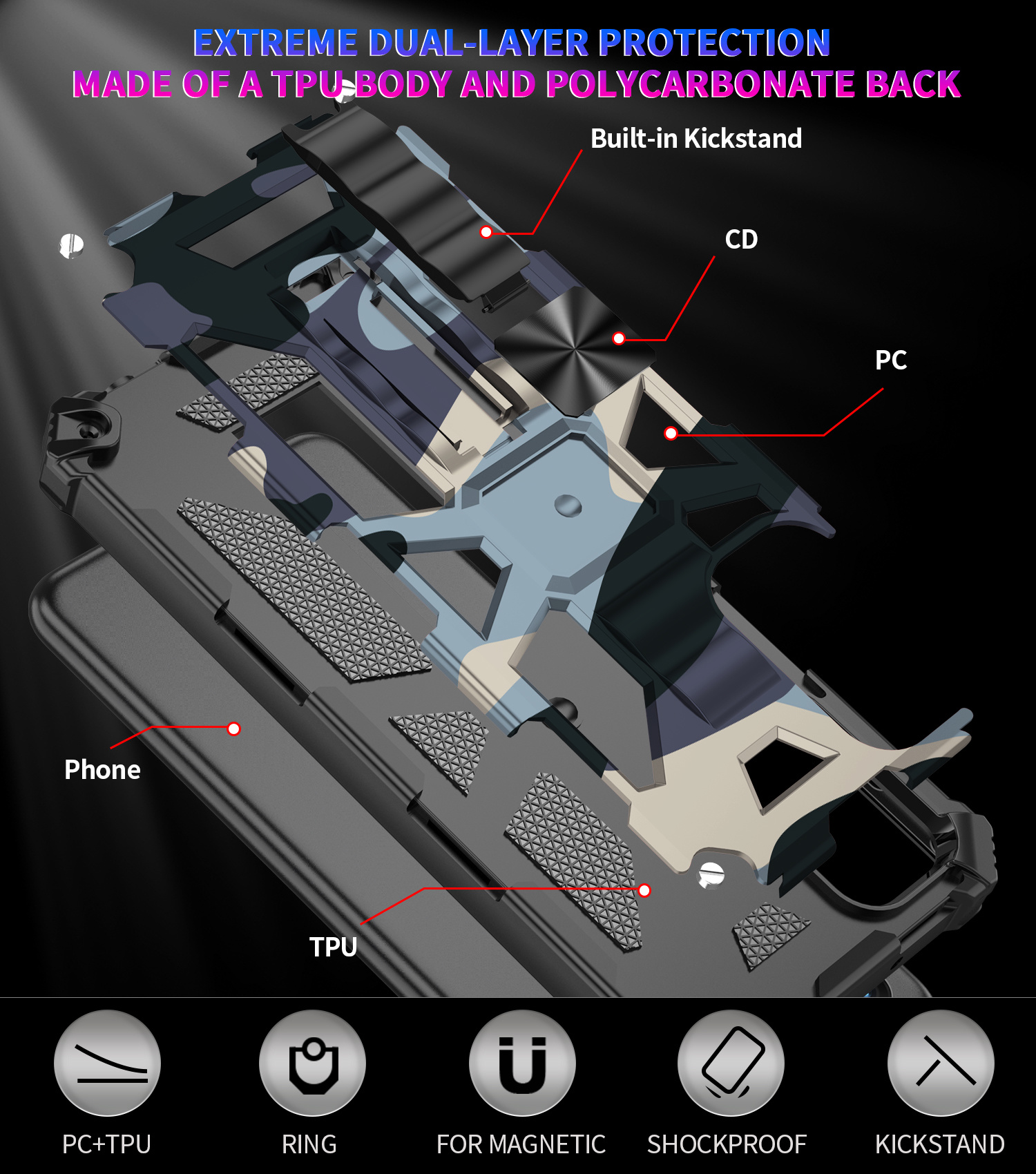 Wil jij je nieuwe Samsung A13 tegen werkelijk alles beschermen? Deze robuuste hoes voor de Samsung A13 biedt uitstekende bescherming tegen vallen, stoten, trillingen, zand en stof. Deze Camouflage Armor hoes is opgebouwd uit een stevig polycarbonaat frame en heeft een perfecte pasvorm. Alle knoppen en aansluitingen blijven toegankelijk! Ondanks dat deze hoes je Samsung A13 aan alle kanten omsluit, blijven alle functionaliteiten toegankelijk. Je kunt alle knoppen blijven bedienen, de camera blijft vrij, en ook de aansluitingen voor de oplader en een koptelefoon blijven gewoon vrij.