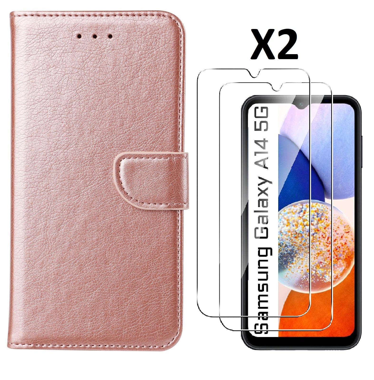 Hoesje Geschikt Voor Samsung Galaxy A14 5G /4G Hoesje met Pasjeshouder - bookcase Portemonnee – Met 2x Screenprotector / gehard glas – Rosegoud