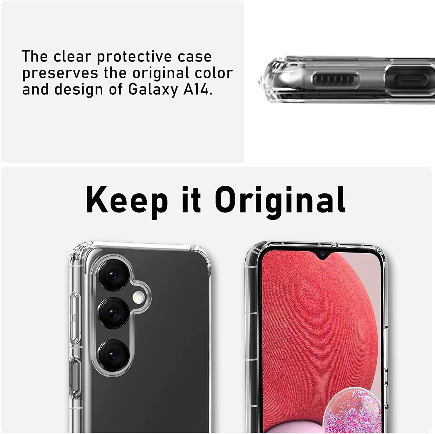 Speciaal gemaakt voor de Samsung Galaxy A14 5G/4G biedt deze Shock Proof hoesje met TPU soft frame de juiste bescherming tegen vallen, stoten, vuil, krassen en andere beschadigingen van uw smartphone. Transparant Shock Proof hoesje met TPU rand, voorzien van de benodigde uitsparingen voor knoppen camera en toegangspoorten. Door het dunne ontwerp van het hoesje wordt er weinig extra grootte toegevoegd aan u smartphone.