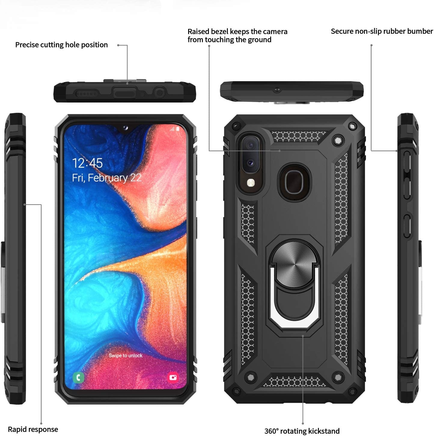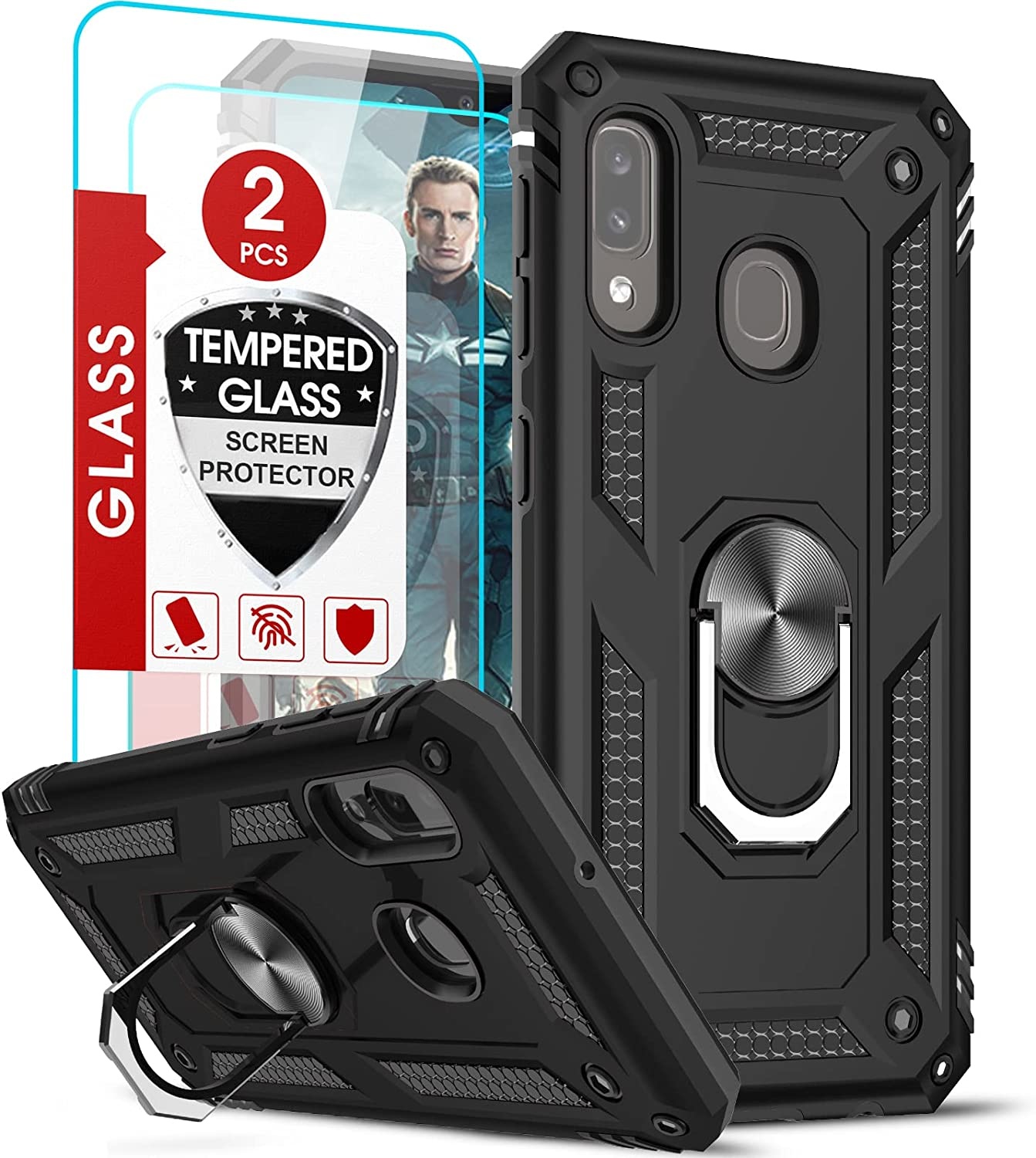 Samsung A20E Hoesje kickstand Armor case Zwart - Galaxy A20e Ring houder TPU backcover hoesje - met Galaxy A20E screenprotector 2 pack