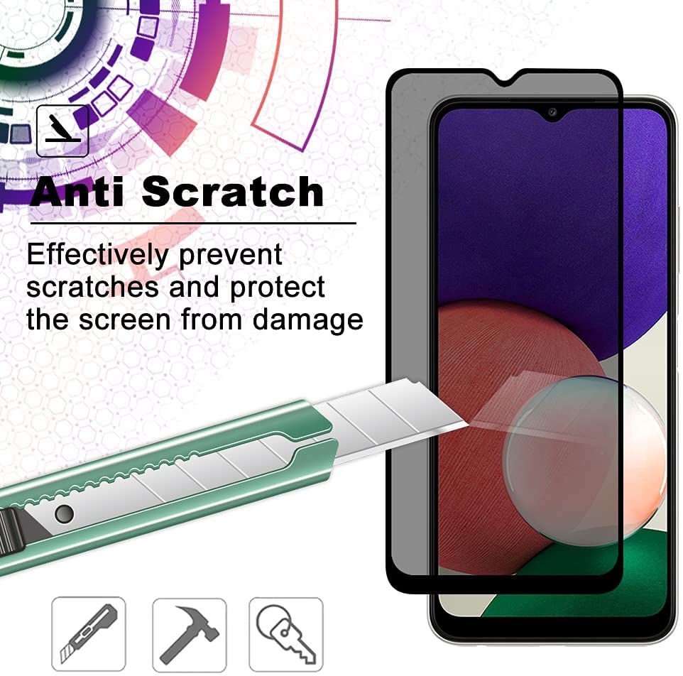 Samsung Galaxy A22 5G Privacy Glazen Screen protector/ Anti Spy Tempered Glass - Schermbescherming tegen meelezers of meekijken op je smartphone. Met het gebruik van deze Privacy tempered glass schermbescherming heb je daar geen last meer van. De Samsung Galaxy A22 5G screenprotector verkleint de kijkhoeken, zo heeft u minder last van mee kijkers. Je heeft alleen vanaf direct voor de scherm goed zicht op je toestel De Samsung Galaxy A22 5G privacy screenprotector is gemaakt van echt glas met een hardheid van 9H en vormt een krasbestendige laag op het scherm van de smartphone waardoor deze optimaal beschermd blijft tegen krassen en stoten.