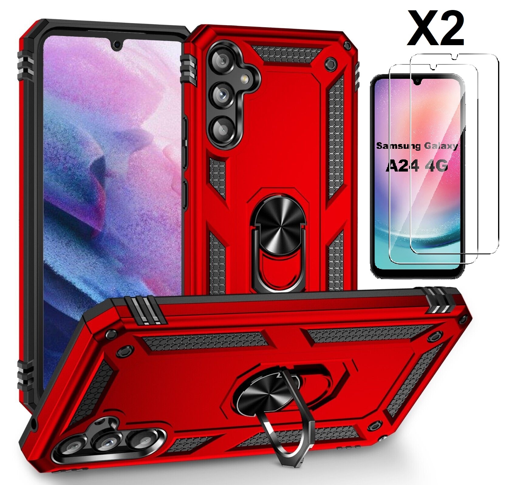 Hoesje Geschikt voor Samsung Galaxy A24 hoesje Rood Met Draaibare Ring Houder - Galaxy A24 Screenprotector - 2 stuks