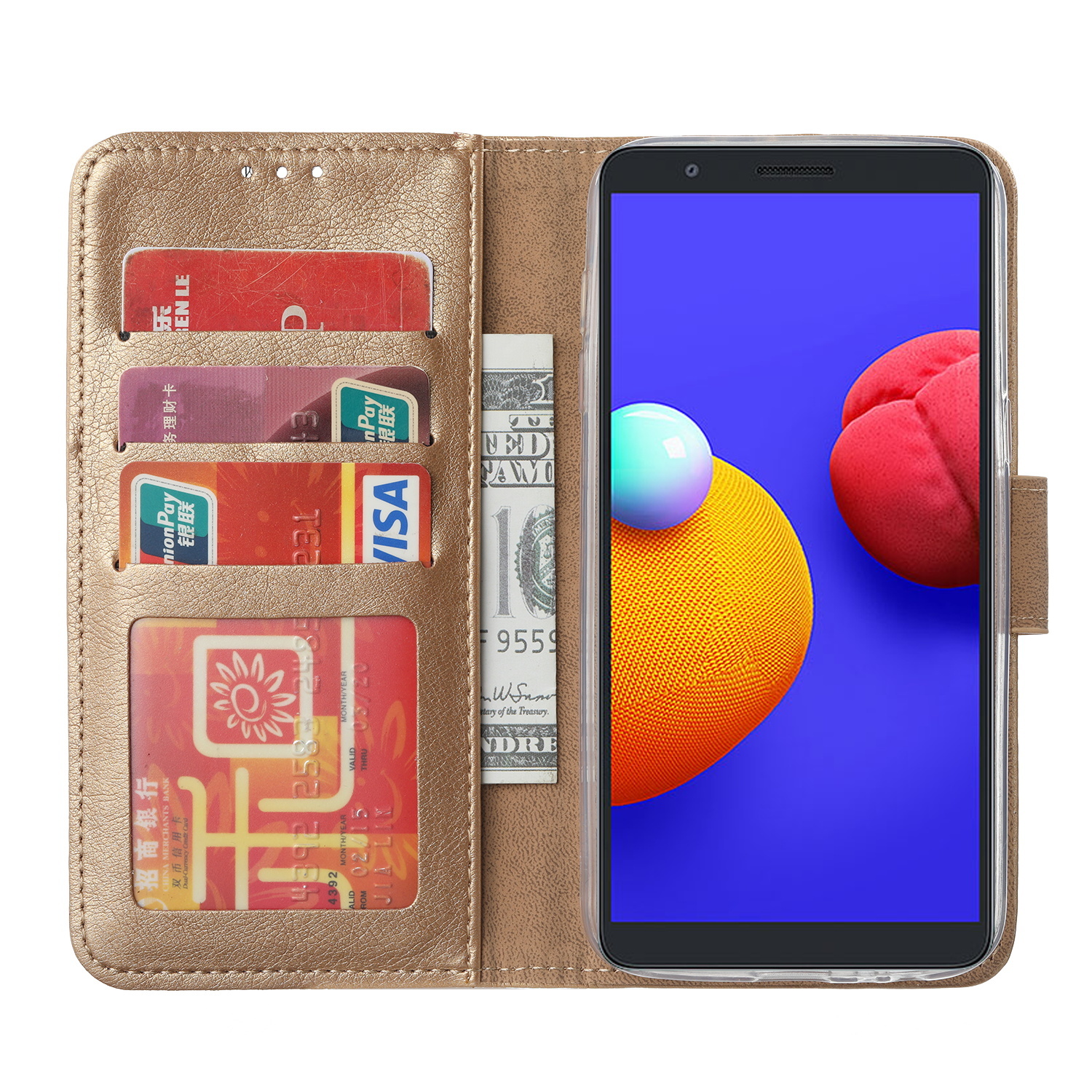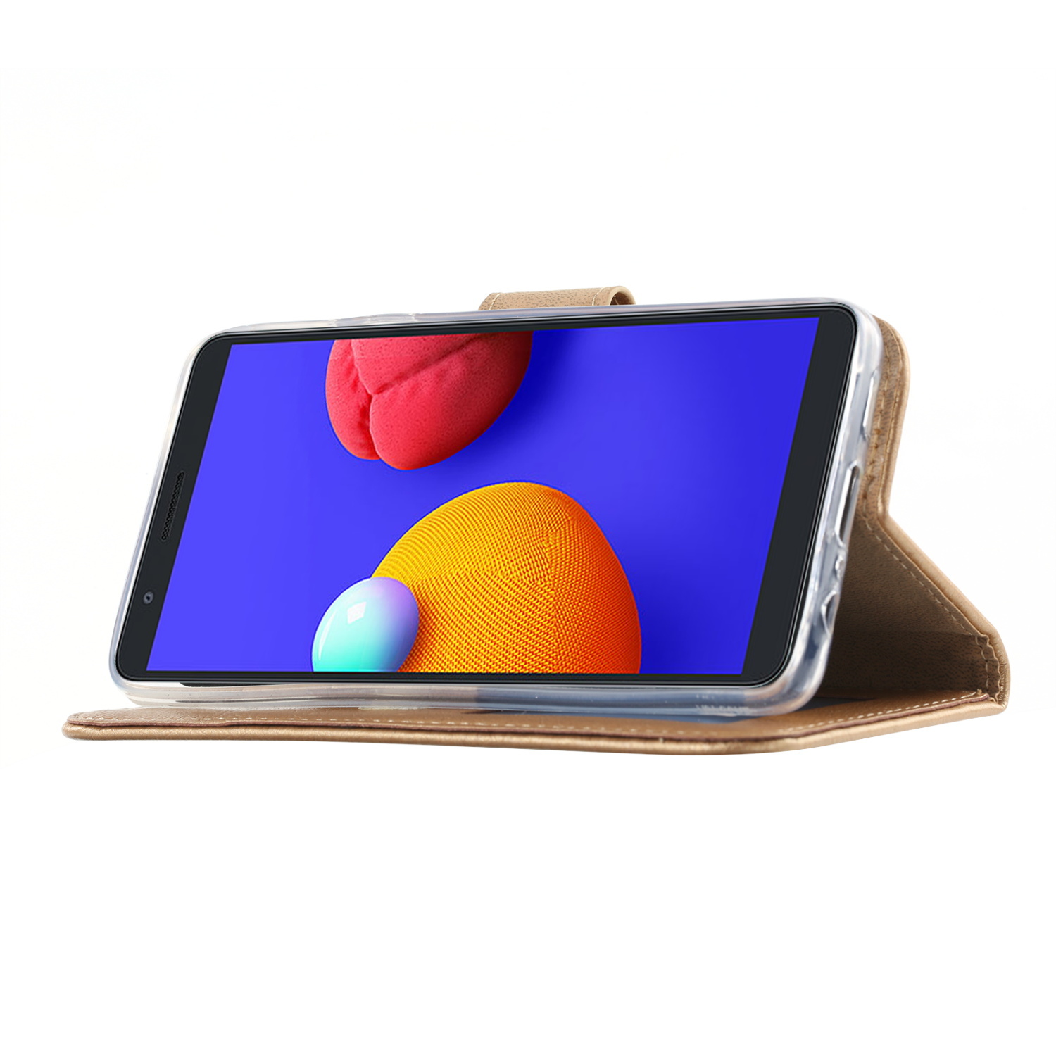 Goud kleurig Hoesje voor je Samsung Galaxy A01 Core 2020 ter bescherming tegen ongewenste gebruikersschade zoals stoten, krassen en stof. Volledig bescherming! In de binnenkant zit een zachte transparante siliconen houder, zo wordt jouw telefoon in dit boek hoesje van alle kanten beschermd tegen vallen en of stoten.