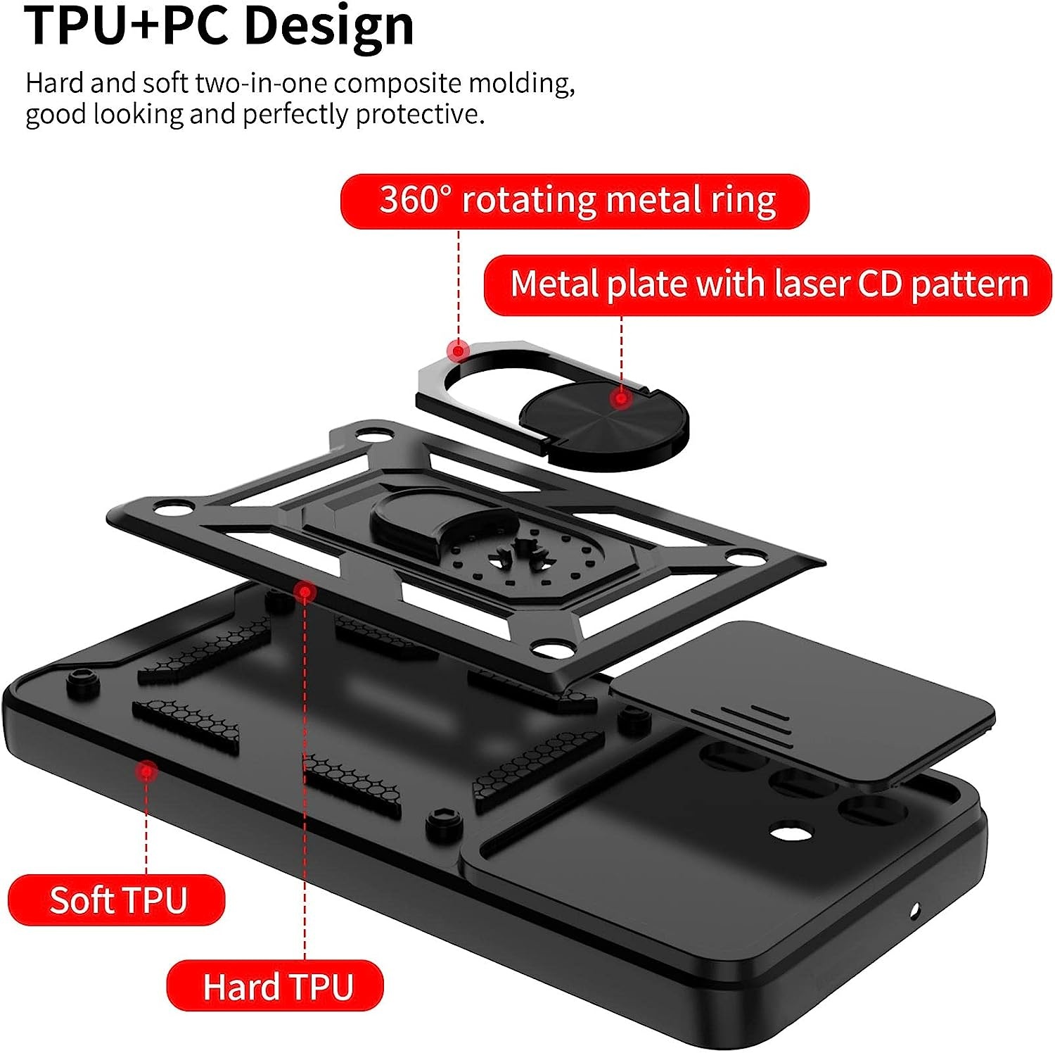 Het hoesje is gemaakt van duurzame materialen zoals siliconen, TPU en PC, en biedt daarmee uitstekende bescherming tegen schade door vallen, stoten en krassen. De ringhouder aan de achterkant van het hoesje biedt extra grip en functionaliteit, zoals het gebruiken van de ringhouder als standaard om handsfree te kijken naar video's of foto's.