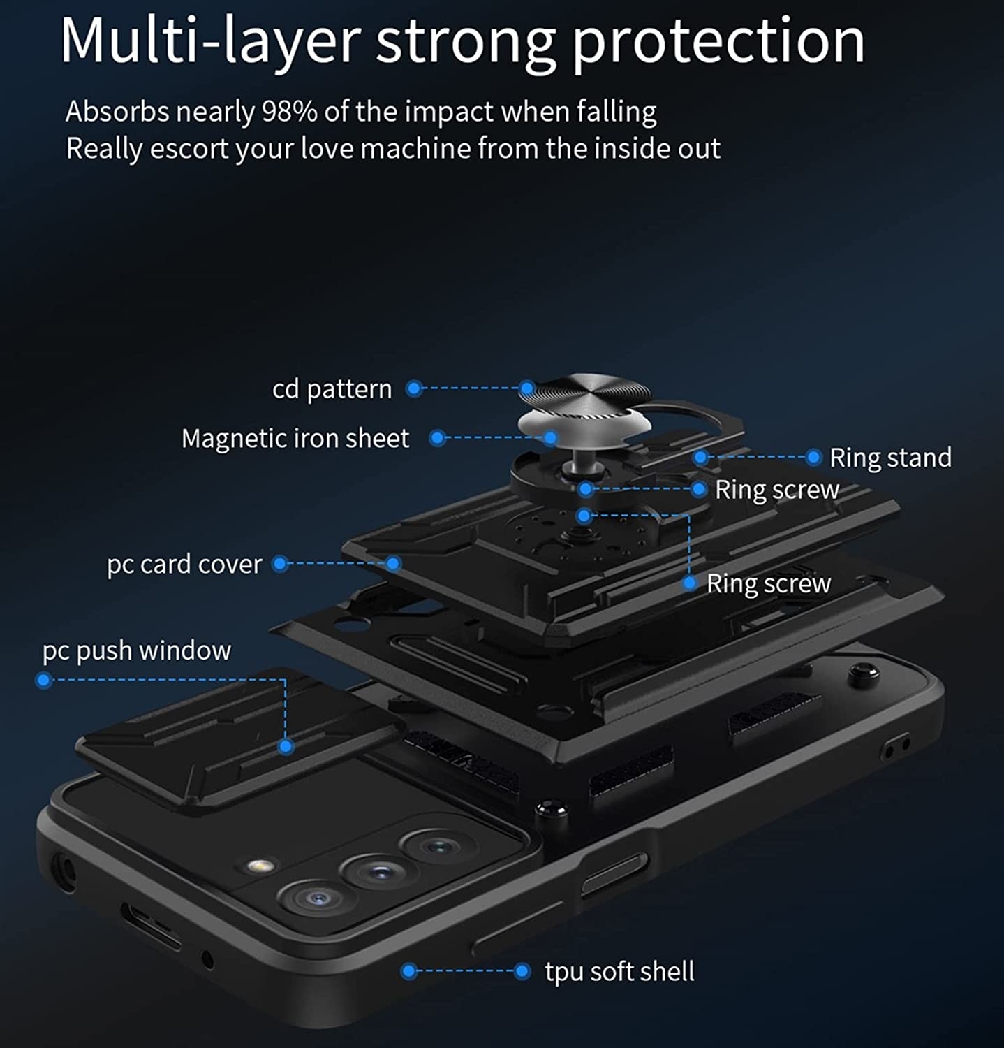 Dit Samsung Galaxy S21 backcover hoesje met ringhouder, camera lens bescherming en pasjeshouder is de nieuwste design in de markt en het past bij jouw telefoon.