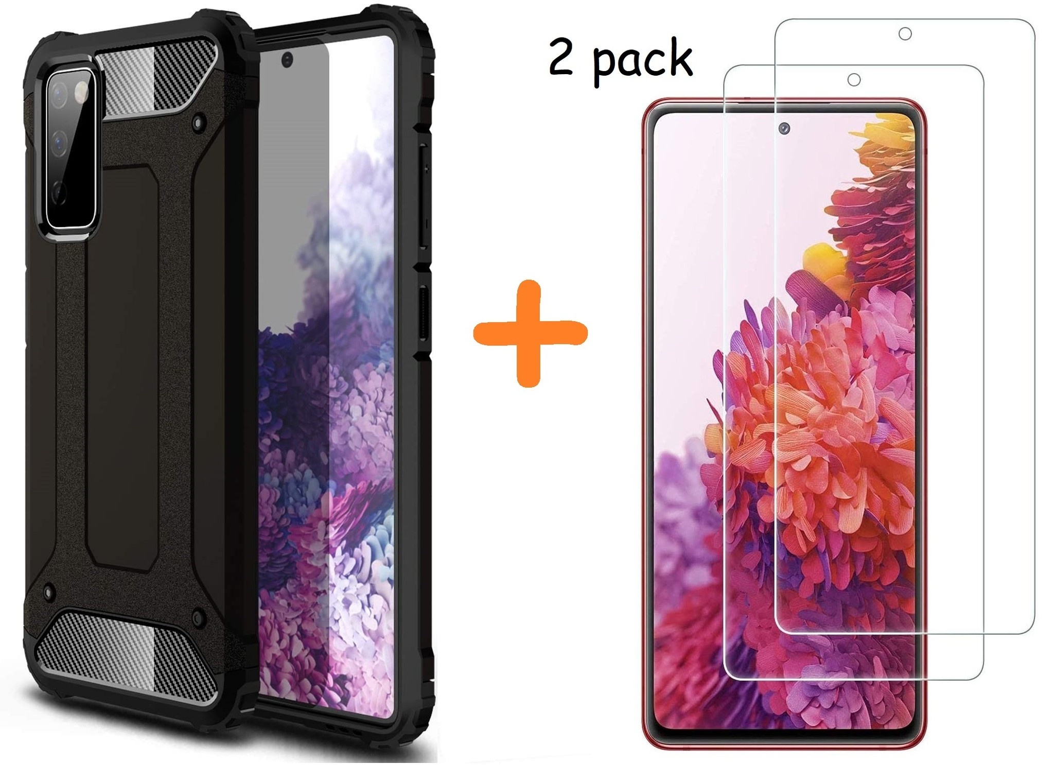 Hoesje Geschikt Voor Samsung Galaxy S20 FE 2022 Hoesje - rugged Armor Hybride case Zwart - Galaxy S20 FE screenprotector 2 pack Glazen tempered glass