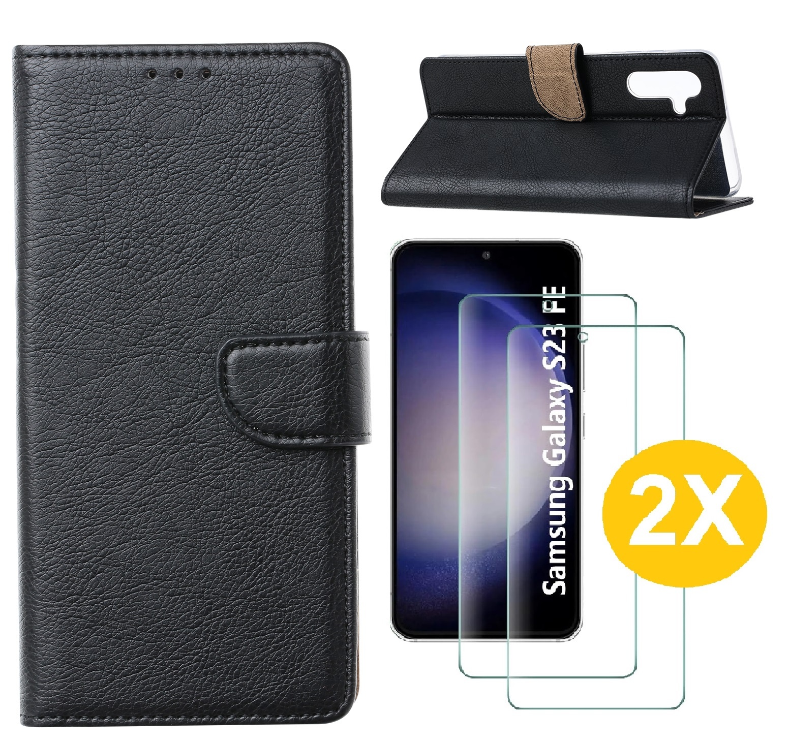 Hoesje Geschikt Voor Samsung Galaxy S23 FE hoesje bookcase Zwart Met screenprotector / 2X Beschermglas