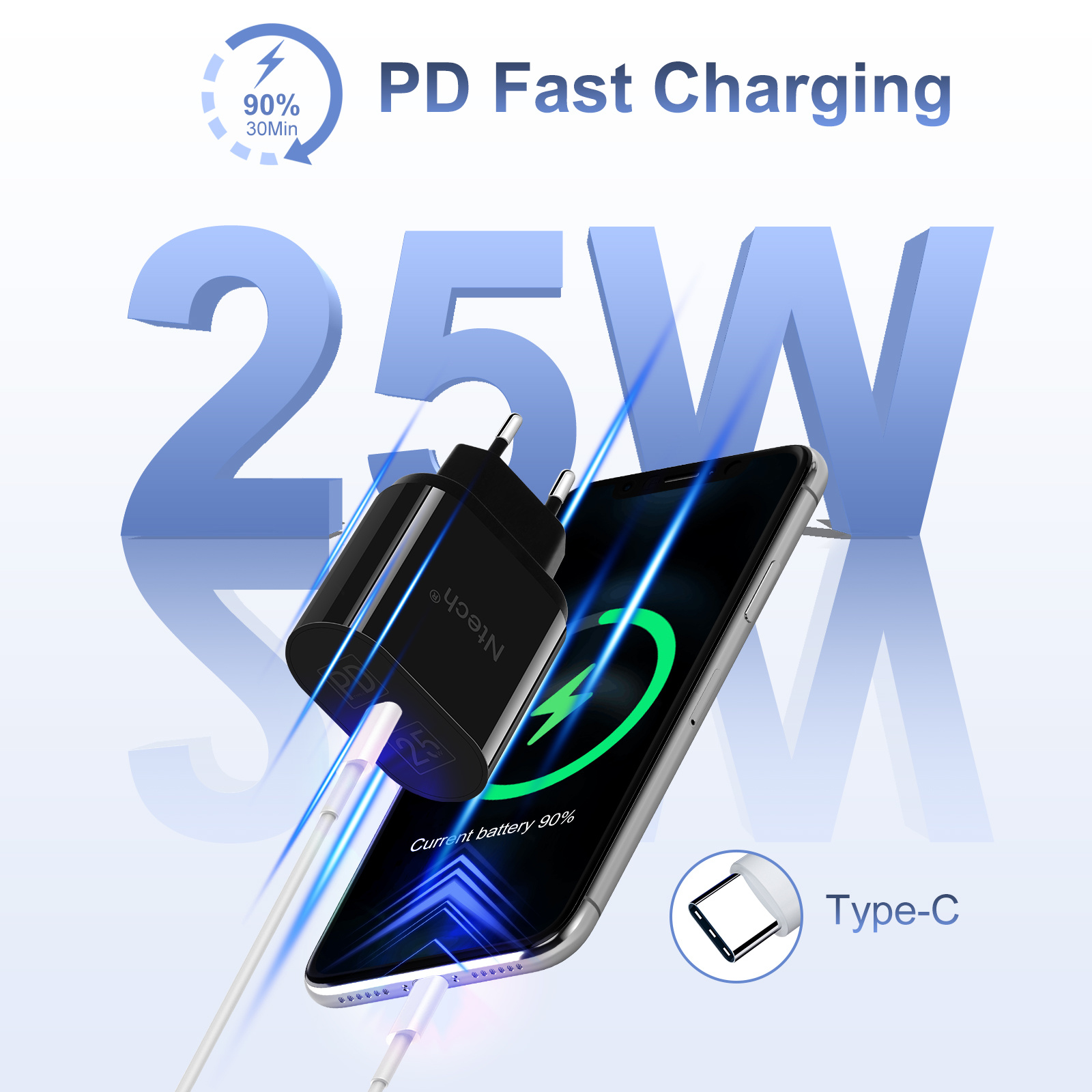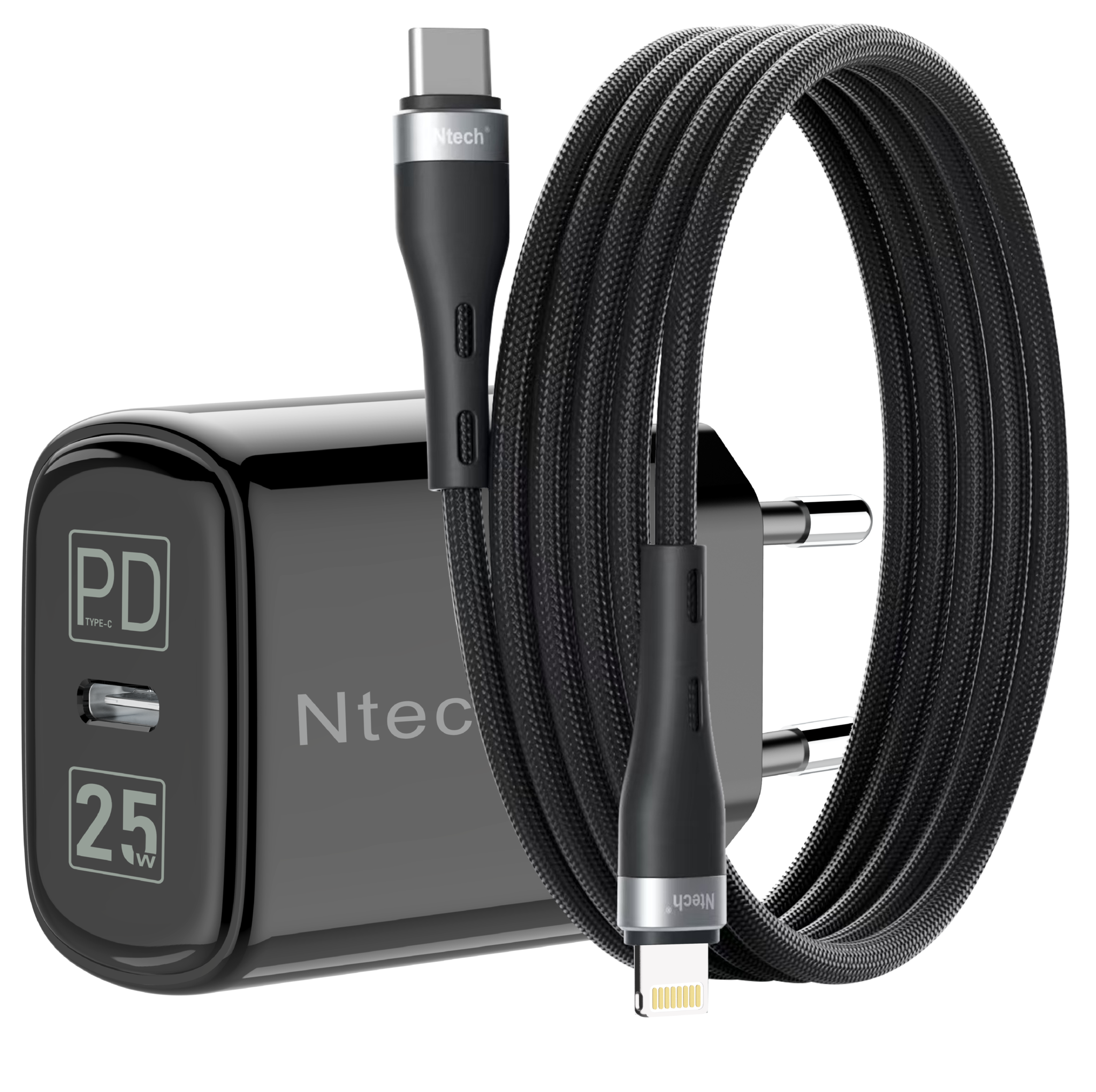 Ntech 25W GaN USB-C Adapter met 1m Nylon USB-C naar Lightning Kabel – Supersnel en Betrouwbaar Opladen voor iPhone
