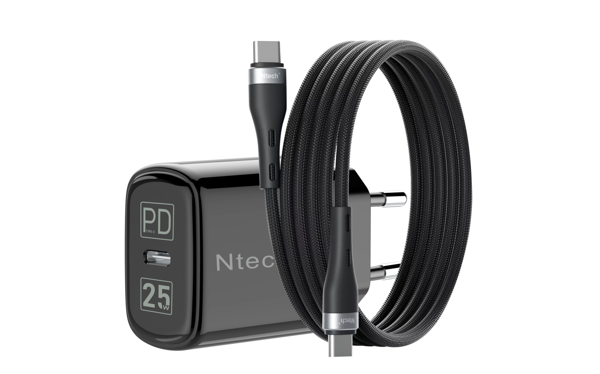 Ntech 25W GaN USB-C Adapter met 2m Nylon USB-C naar USB-C Kabel – Supersnel, Compact en Duurzaam