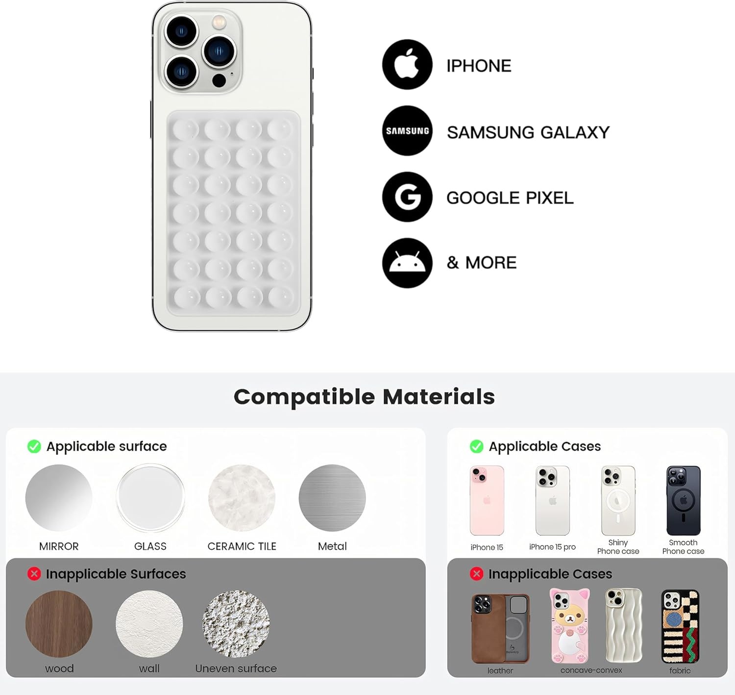 Superior Grip: Featuring 24 independent suction pads, these holders deliver outstanding adhesion to phone cases and smooth surfaces. Keep your hands free with complete peace of mind—no slips, no falls.