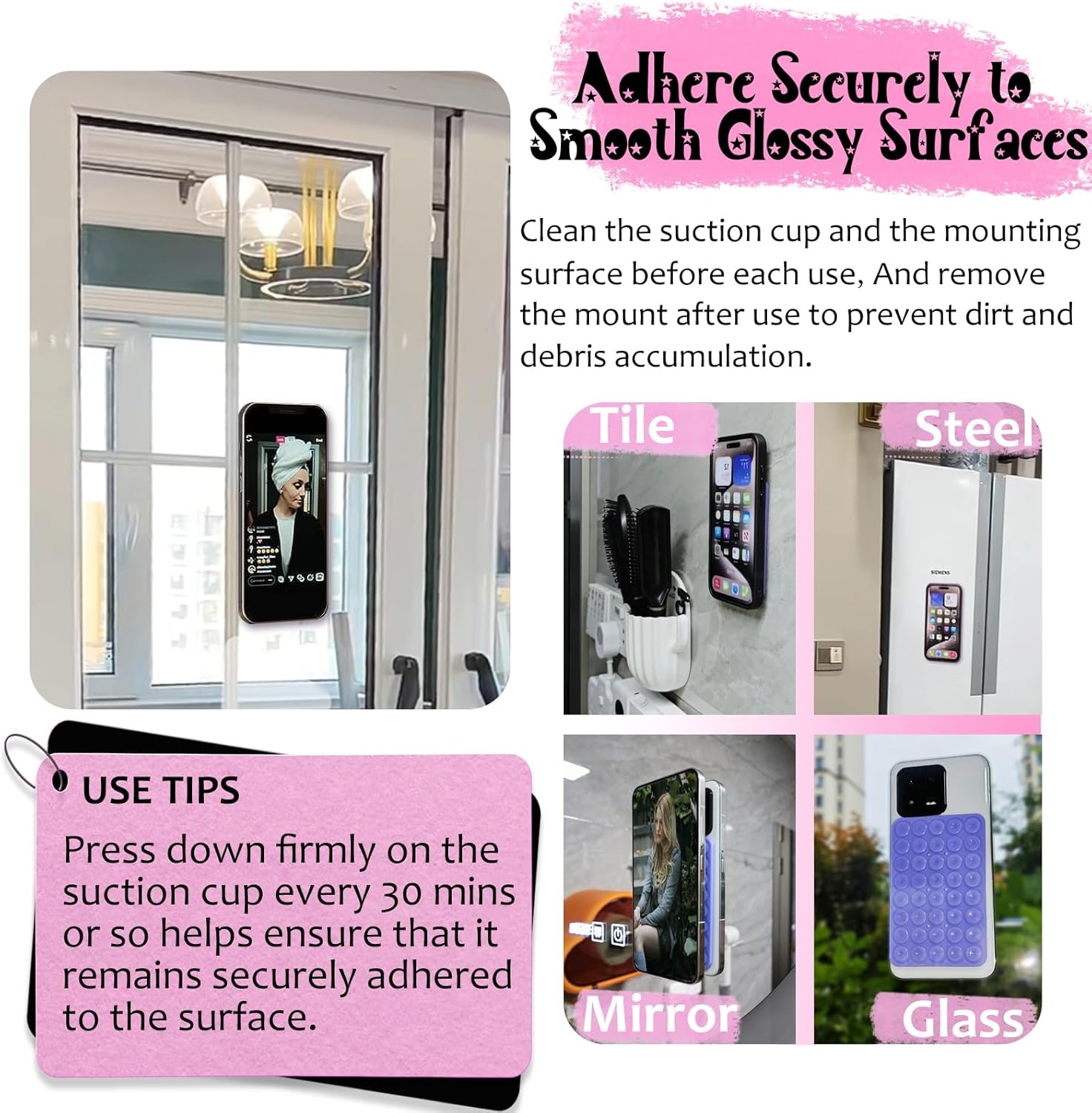 Multi-Purpose Use: Perfectly compatible with all mobile devices, these double-sided suction cups work effortlessly on mirrors, windows, tiles, and other smooth surfaces. Ideal for selfies, watching videos, video calls, or hands-free use in the kitchen, gym, dance studio, or bathroom.