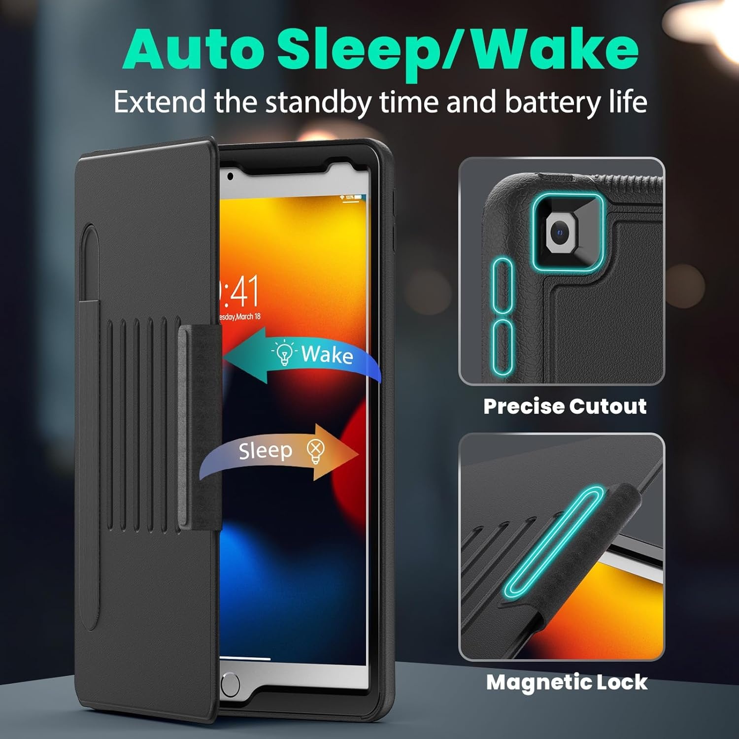 Auto Sleep/Wake Functie: Dankzij de slimme auto sleep/wake functie wordt je iPad Hoes 5e, 6e, Air 1e, Air 2e Generatie - 9.7 inch (2017/2018) automatisch wakker bij het openen van de hoes en wordt het in slaapstand gezet wanneer de hoes wordt gesloten. Dit helpt je batterij te sparen en biedt snel toegang tot je apparaat zonder gedoe.