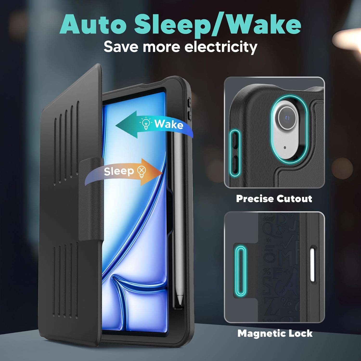 Auto Sleep/Wake Functie: Dankzij de slimme auto sleep/wake functie wordt je iPad Air 11-Inch M3/M2 (2025/2024), iPad Air 5/4 (2022/2020 5th/4th Generation 10.9-Inch) automatisch wakker bij het openen van de hoes en wordt het in slaapstand gezet wanneer de hoes wordt gesloten. Dit helpt je batterij te sparen en biedt snel toegang tot je apparaat zonder gedoe.