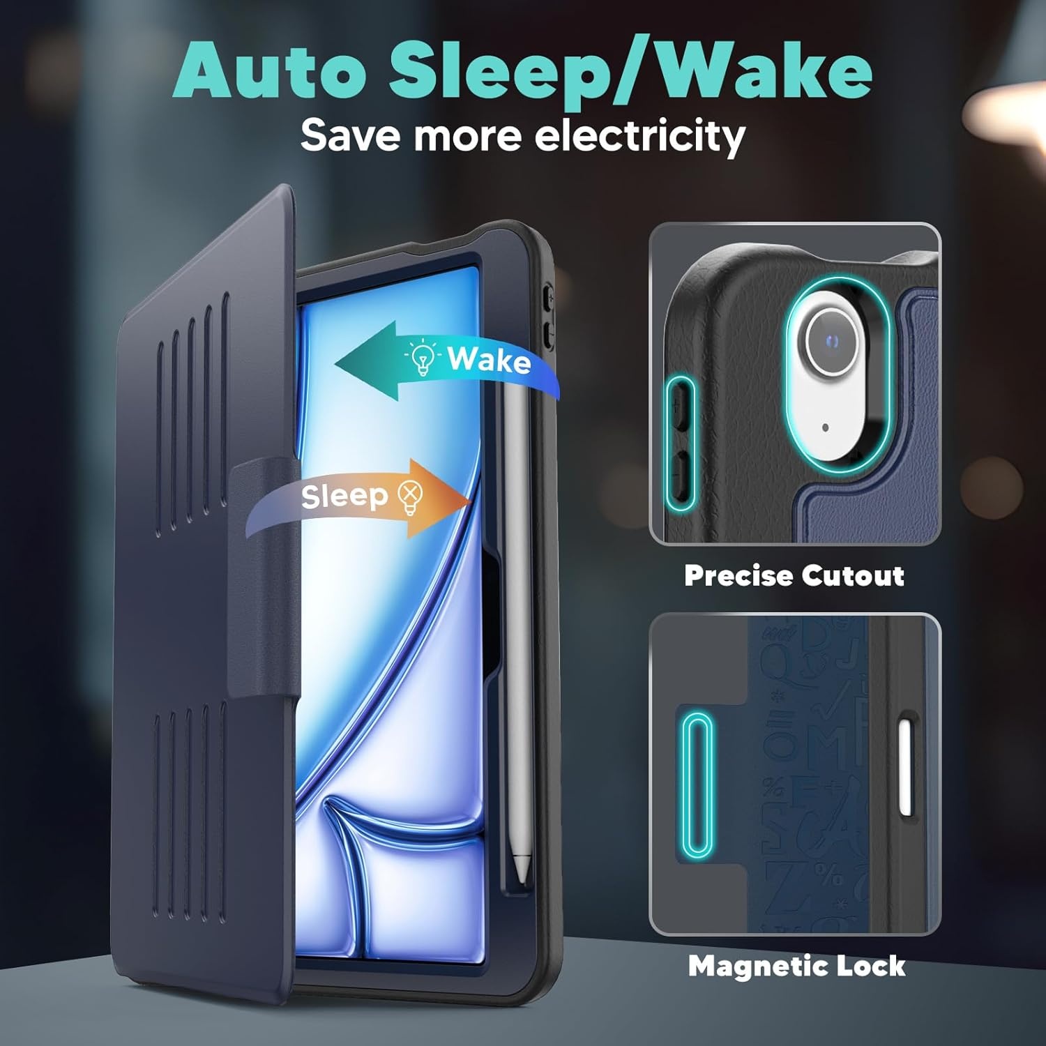 Auto Sleep/Wake Functie: Dankzij de slimme auto sleep/wake functie wordt je iPad Air 11-Inch M3/M2 (2025/2024), iPad Air 5/4 (2022/2020 5th/4th Generation 10.9-Inch) automatisch wakker bij het openen van de hoes en wordt het in slaapstand gezet wanneer de hoes wordt gesloten. Dit helpt je batterij te sparen en biedt snel toegang tot je apparaat zonder gedoe.