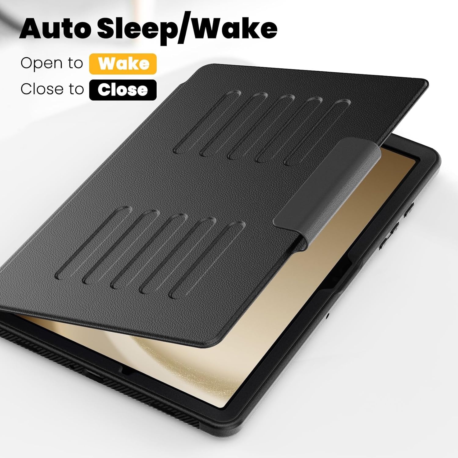 Auto Sleep/Wake Functie: Dankzij de slimme auto sleep/wake functie wordt je Samsung Galaxy Tab A9 Plus automatisch wakker bij het openen van de hoes en wordt het in slaapstand gezet wanneer de hoes wordt gesloten. Dit helpt je batterij te sparen en biedt snel toegang tot je apparaat zonder gedoe.