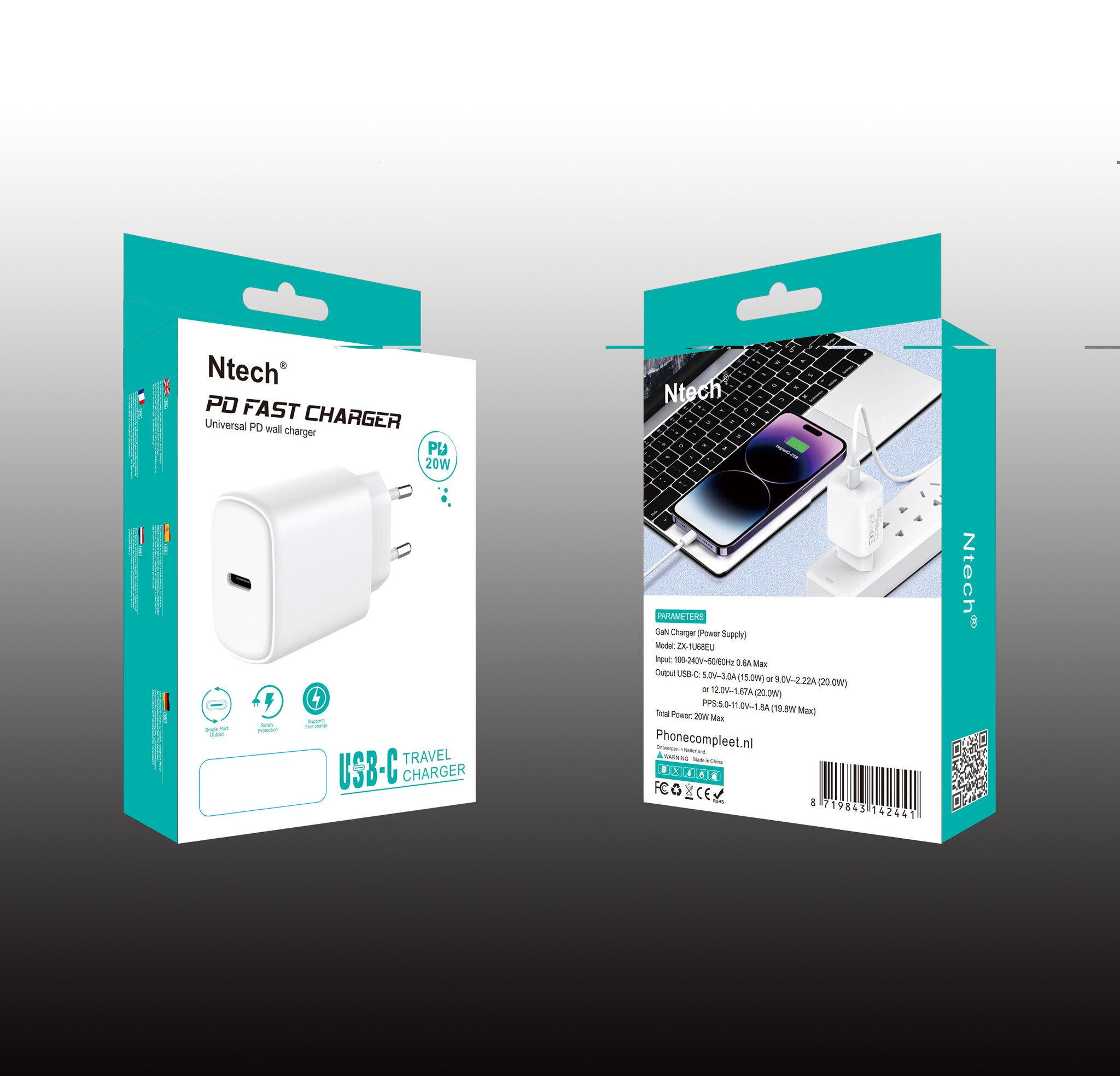 Dankzij de geavanceerde GaN (Gallium Nitride) technologie levert de Ntech adapter krachtige prestaties in een verrassend compact ontwerp. Met 20W Power Delivery laad je je iPhone tot wel 50% op in slechts 30 minuten. Perfect voor onderweg, thuis of op kantoor.