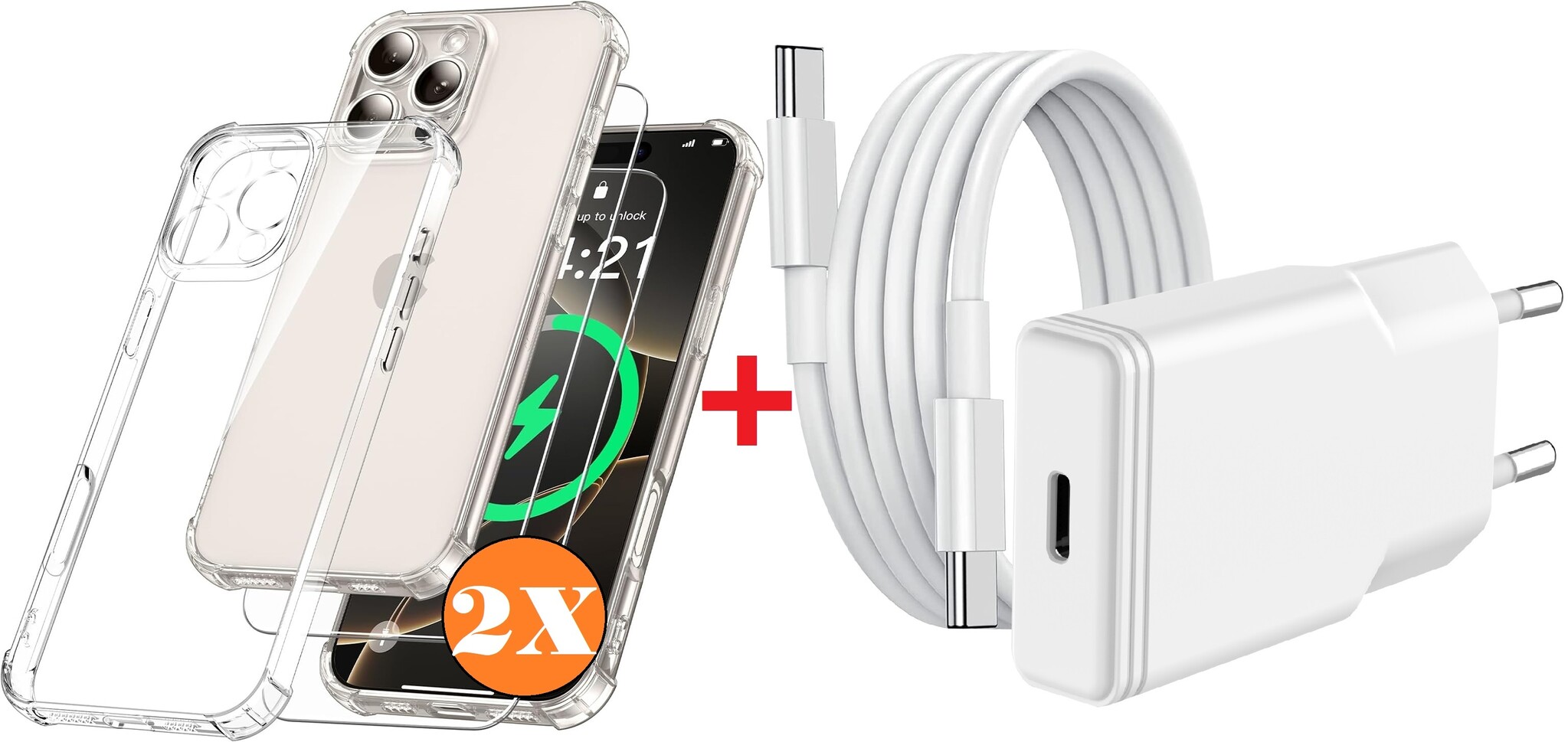USB C Adapter - oplader - USB C Snellader 20W Met 1m Kabel - Hoesje Geschikt voor iPhone 16 Pro Max hoesje transparant Anti Shock silicone met 2x screenprotector- Ntech COMBI-SET