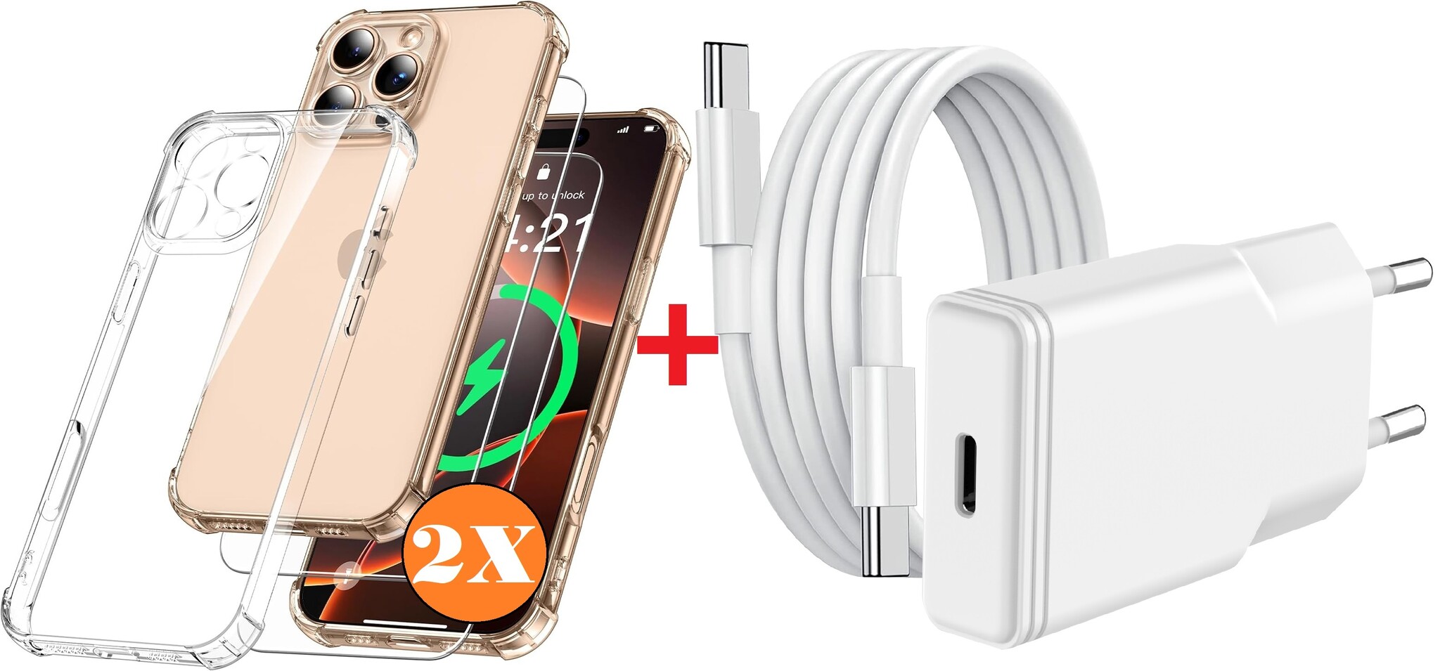 USB C Adapter - oplader - USB C Snellader 20W Met 1m Kabel - Hoesje Geschikt voor iPhone 16 Pro hoesje transparant Anti Shock silicone met 2x screenprotector- Ntech COMBI-SET