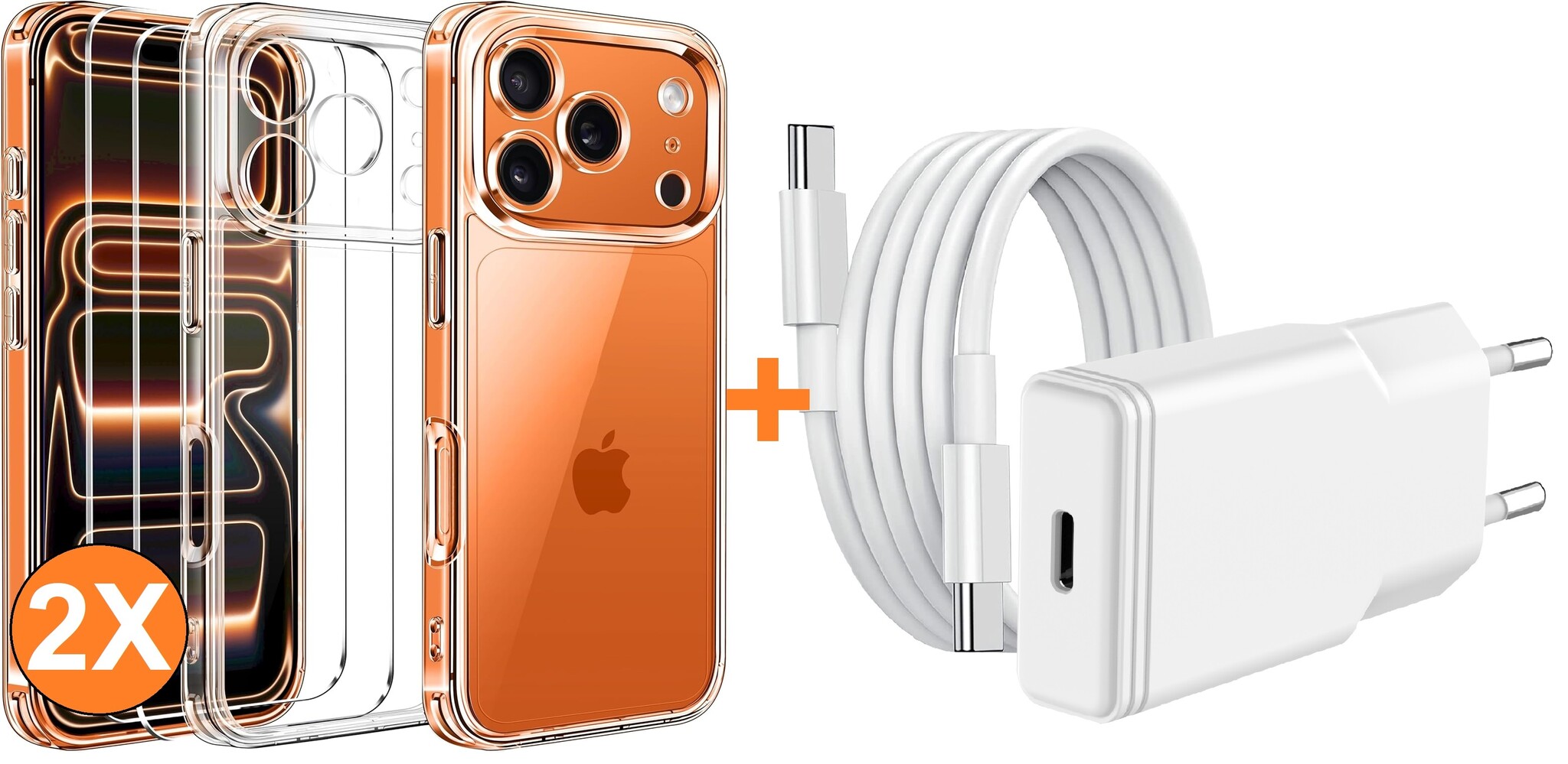 USB C Adapter - USB C Oplader 20W Met USB C Kabel 1M - Hoesje Geschikt voor iPhone 17 Pro Max transparant Anti Shock silicone met 2x screenprotector- Ntech COMBI-SET