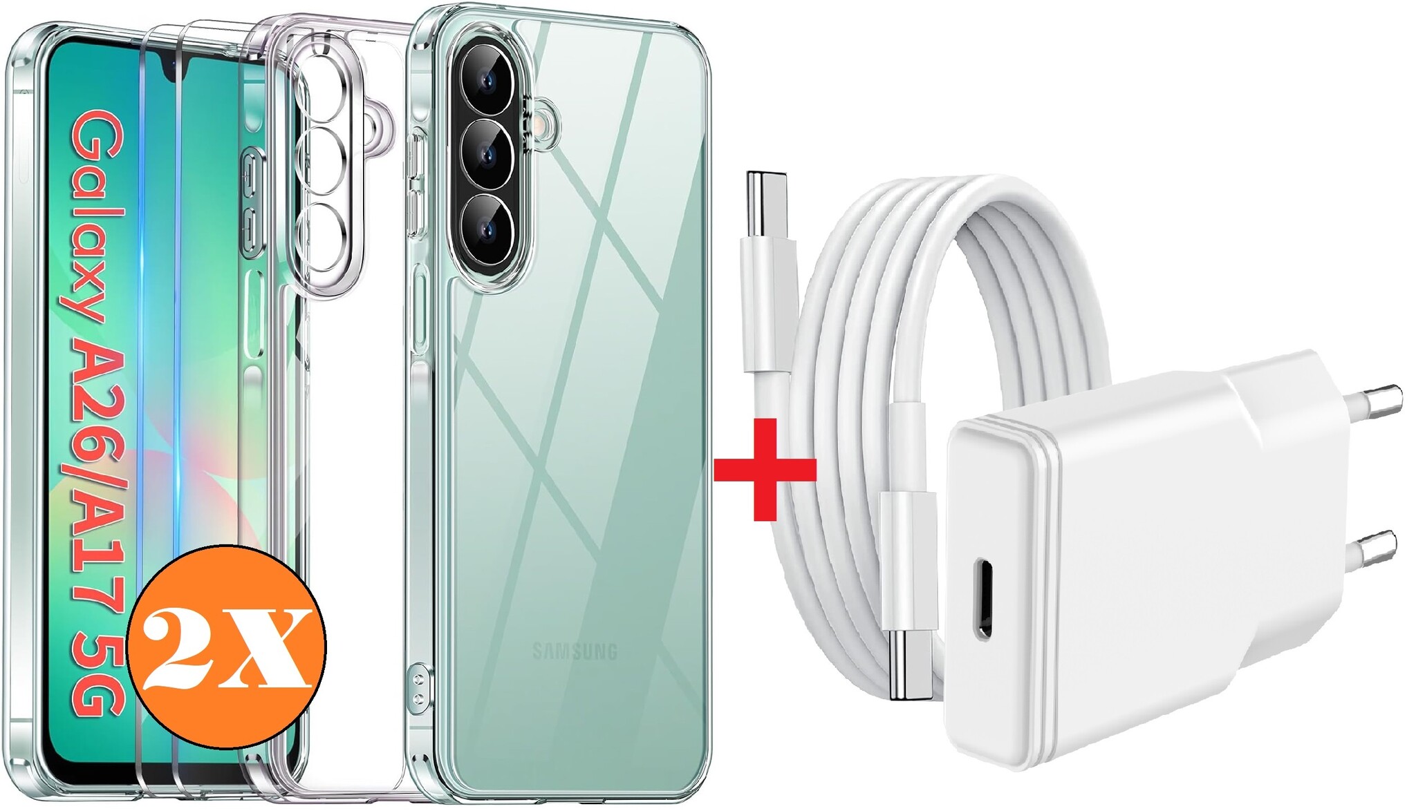 USB C Adapter oplader - USB C Snellader 20W Met 1m Kabel - Hoesje Geschikt voor Samsung Galaxy A17 5G transparant Anti Shock silicone met 2x screenprotector- Ntech COMBI-SET