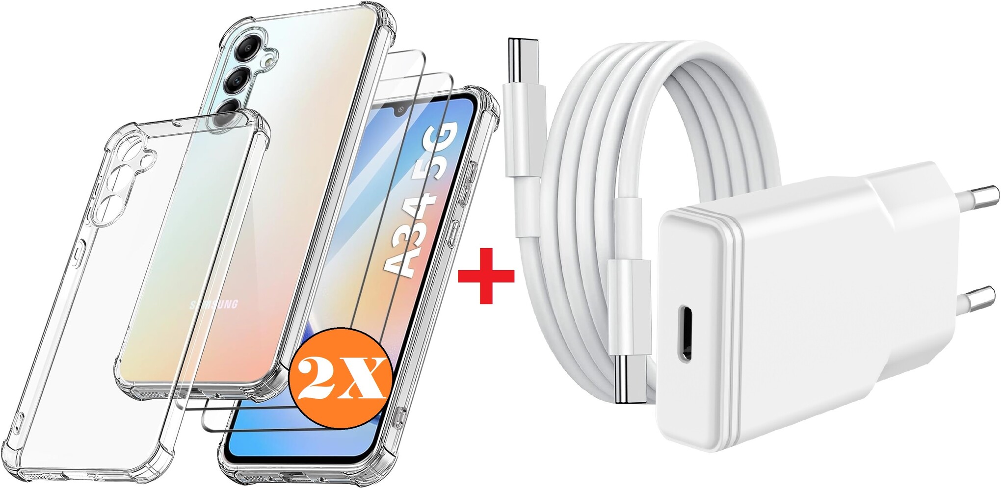 USB C Adapter - oplader - USB C Snellader 20W Met 1m Kabel - Hoesje Geschikt voor Samsung Galaxy A34 hoesje transparant Anti Shock silicone met 2x screenprotector- Ntech COMBI-SET