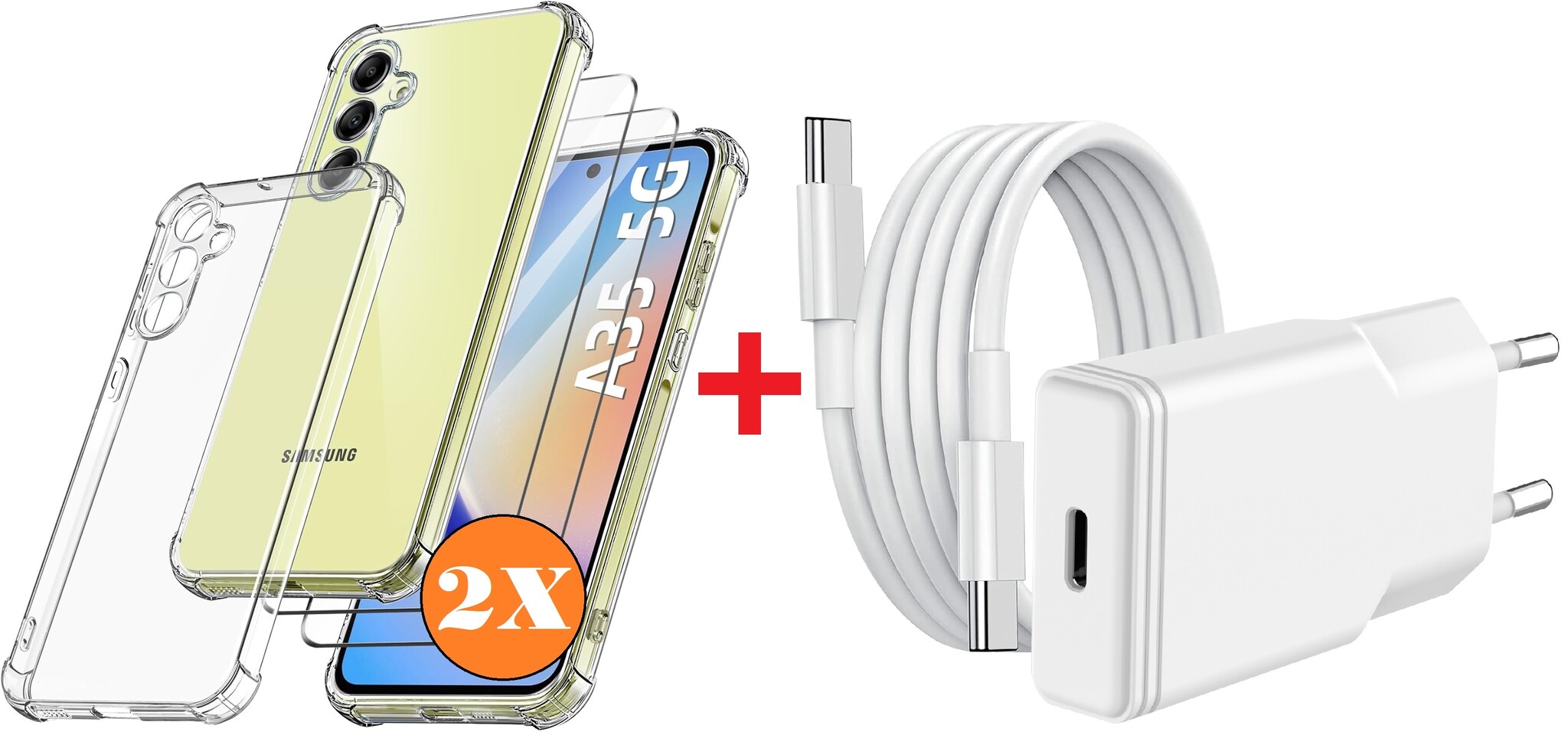 USB C Adapter - oplader - USB C Snellader 20W Met 1m Kabel - Hoesje Geschikt voor Samsung Galaxy A35 hoesje transparant Anti Shock silicone met 2x screenprotector- Ntech COMBI-SET