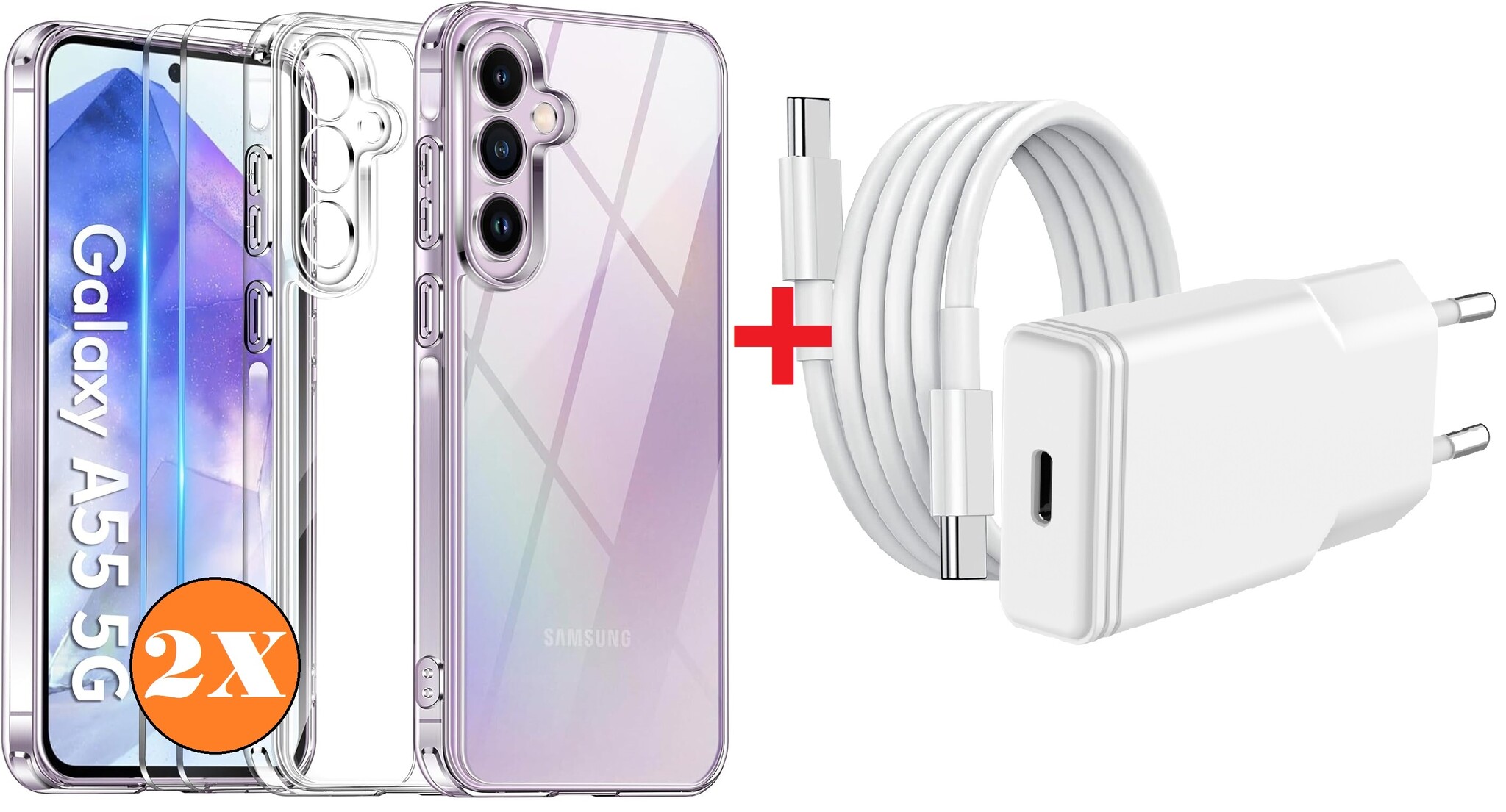USB C Adapter - oplader - USB C Snellader 20W Met 1m Kabel - Hoesje Geschikt voor Samsung Galaxy A55 hoesje transparant Anti Shock silicone met 2x screenprotector- Ntech COMBI-SET