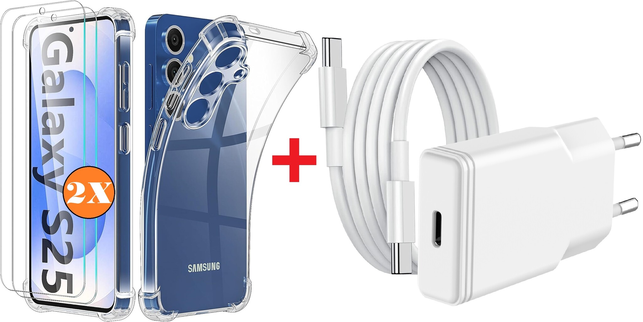 USB C Adapter - oplader - USB C Snellader 20W Met 1m Kabel - Hoesje Geschikt voor Samsung Galaxy S25 / S24 hoesje transparant Anti Shock silicone met 2x screenprotector- Ntech COMBI-SET