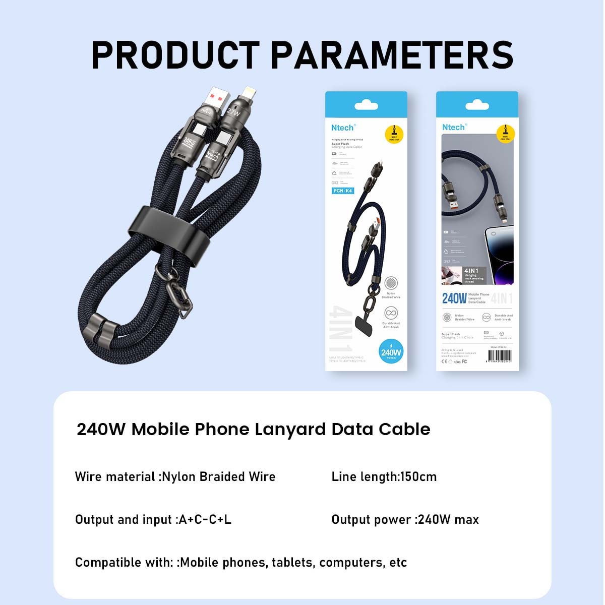 Upgrade je oplaadervaring met deze 4-in-1 240W kabel. De combinatie van hoogwaardige materialen, veelzijdige connectoren en gebruiksvriendelijk ontwerp maakt het de perfecte accessoire voor studenten, professionals en iedereen die waarde hecht aan gemak en efficiëntie. Blijf opgeladen en georganiseerd, waar het leven je ook brengt!