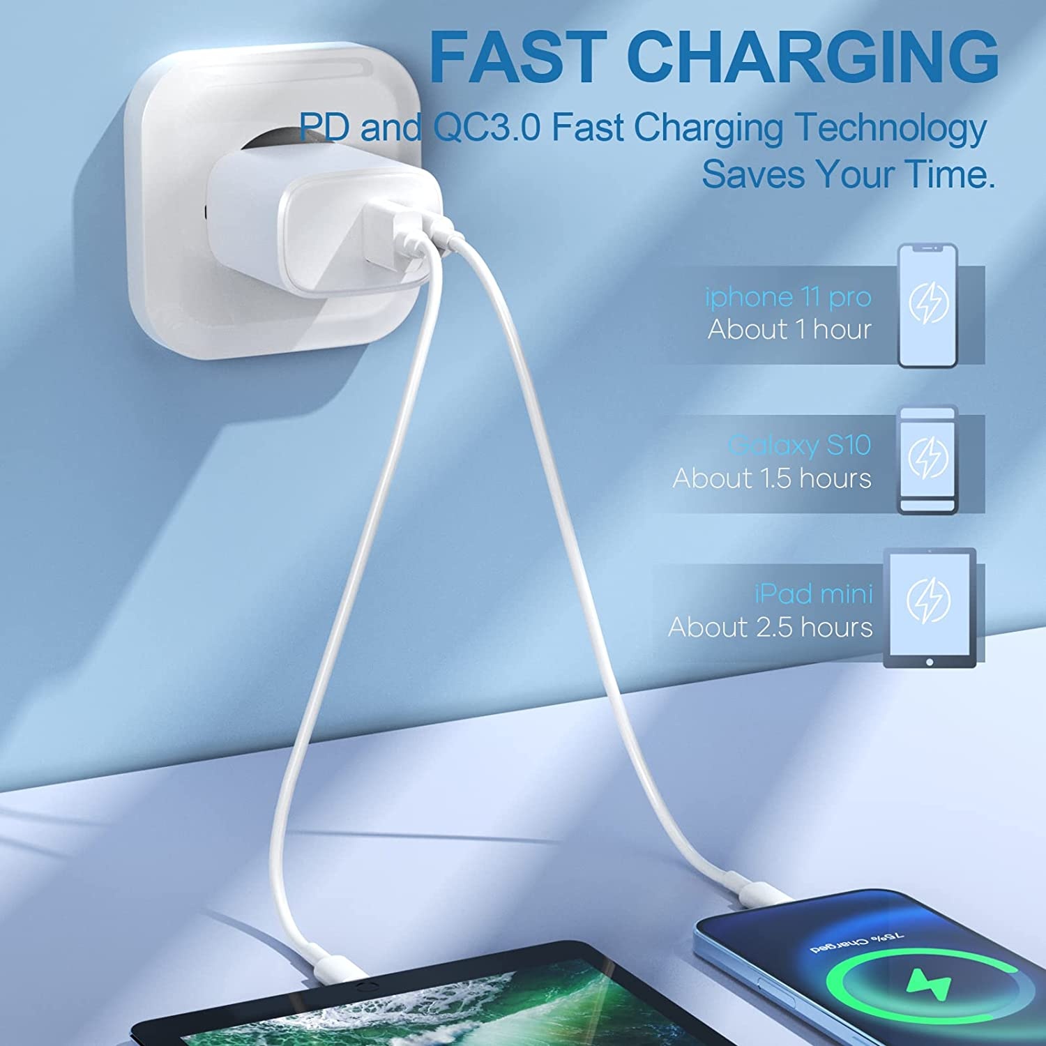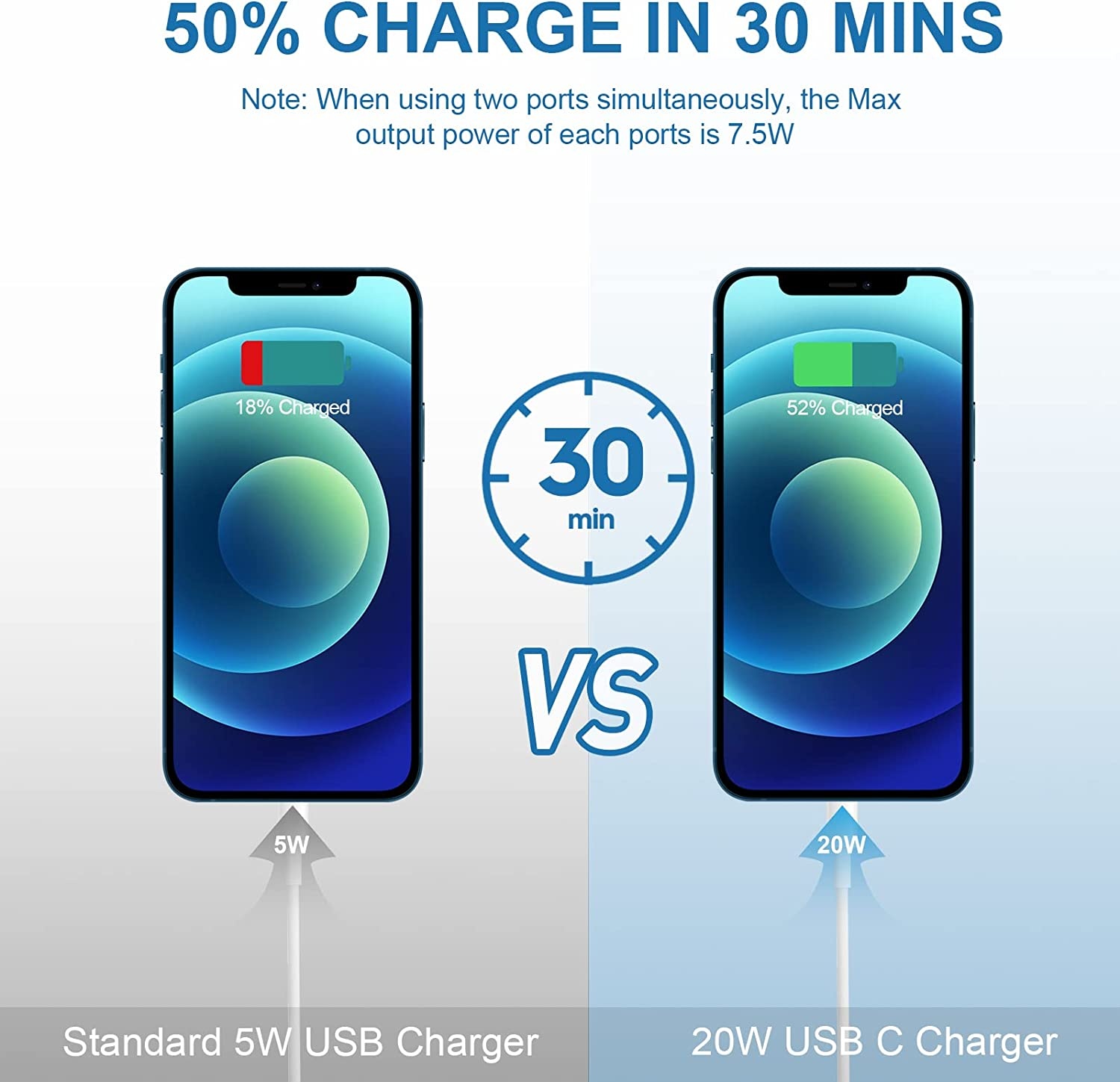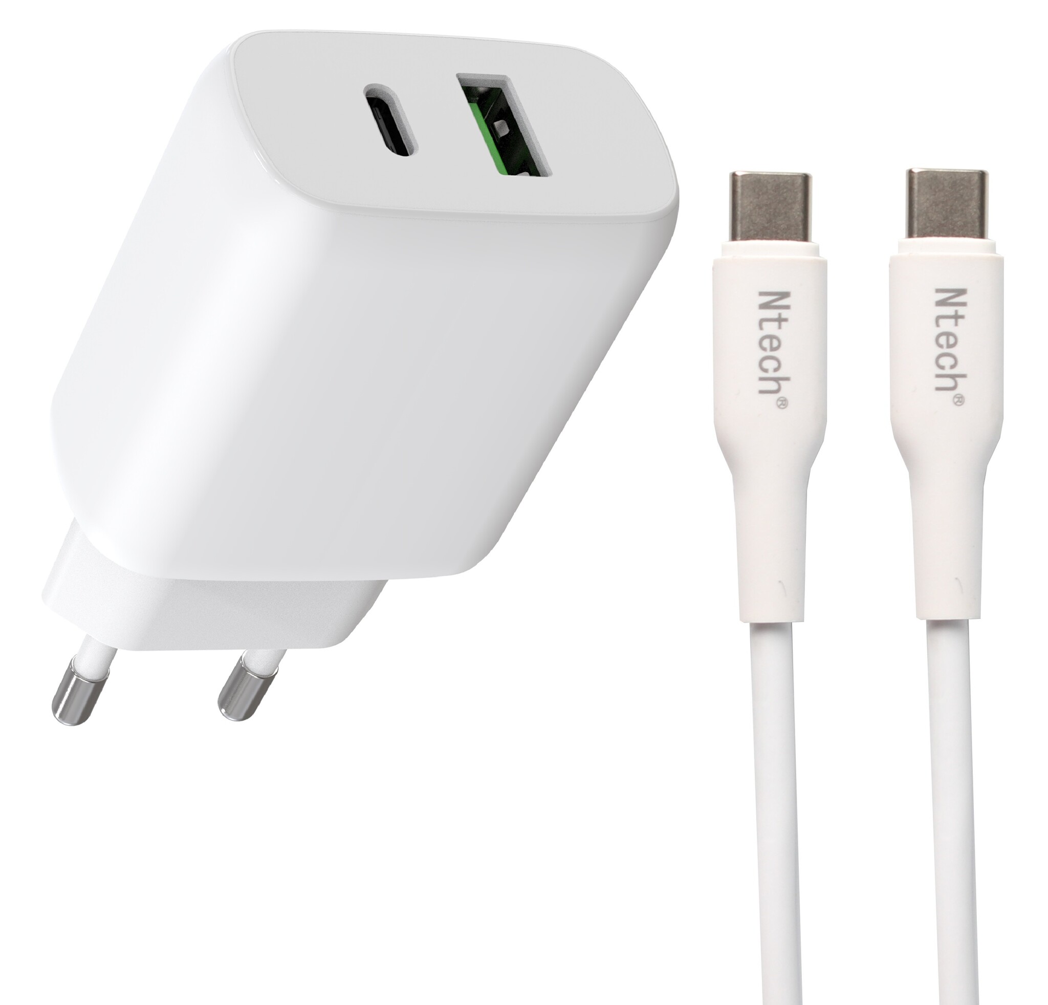 Onze 25W USB-C adapter is een veelzijdige krachtpatser. Met zowel een USB-C als een USB-A poort biedt deze adapter voldoende vermogen om diverse apparaten op te laden, van smartphones tot tablets, en zelfs enkele laptops.