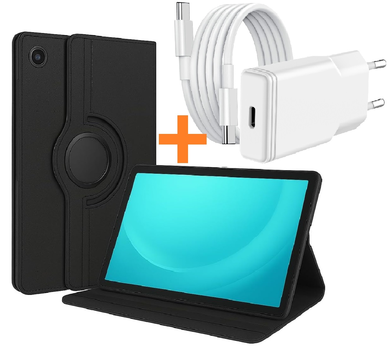 USB C Adapter - USB C oplader- Slim Snellader 20W Met USB C Kabel 1m - Hoesje Geschikt voor Samsung Galaxy Tab A11 Plus / A9 Plus – 360° draaibaar tablethoes Zwart - Ntech COMBI-SET